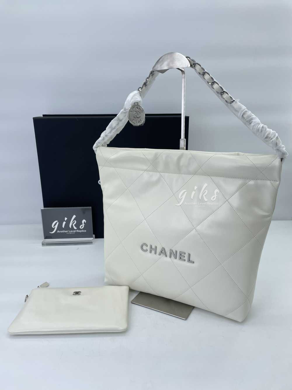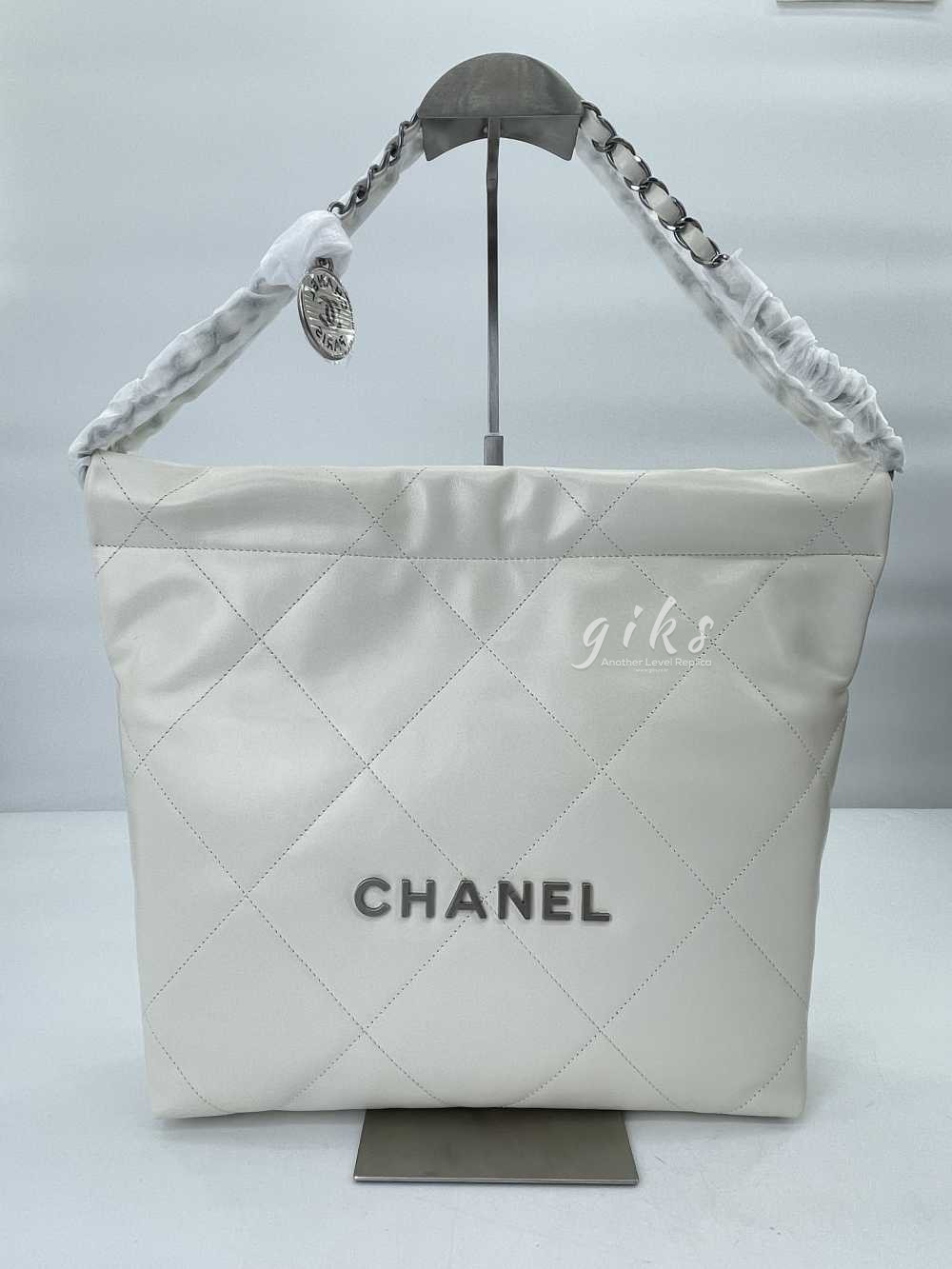 샤넬 22 스몰 핸드백 카프스킨 & 실버 메탈 화이트
