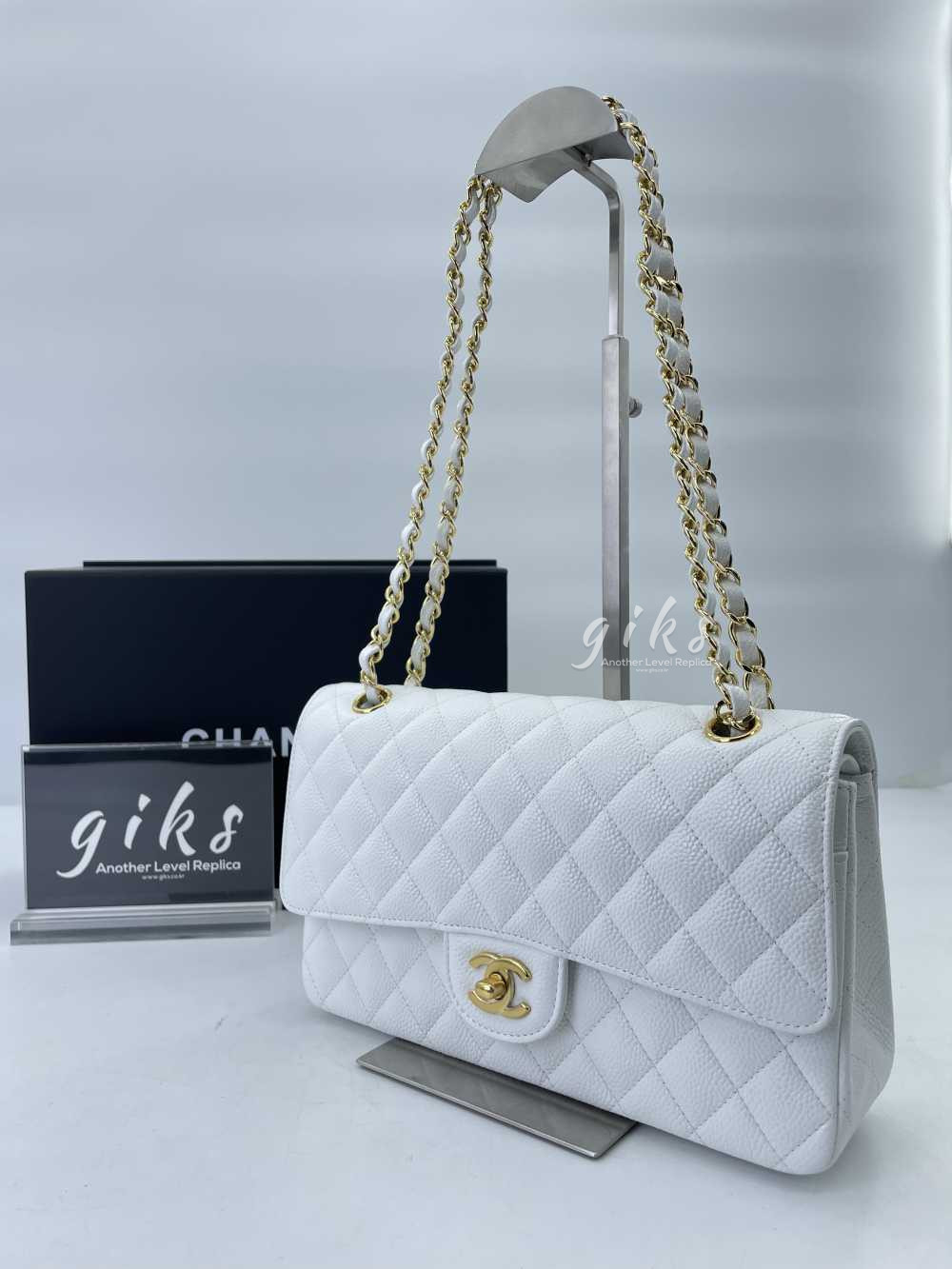 샤넬 클래식 미디움 카프스킨 화이트 골드