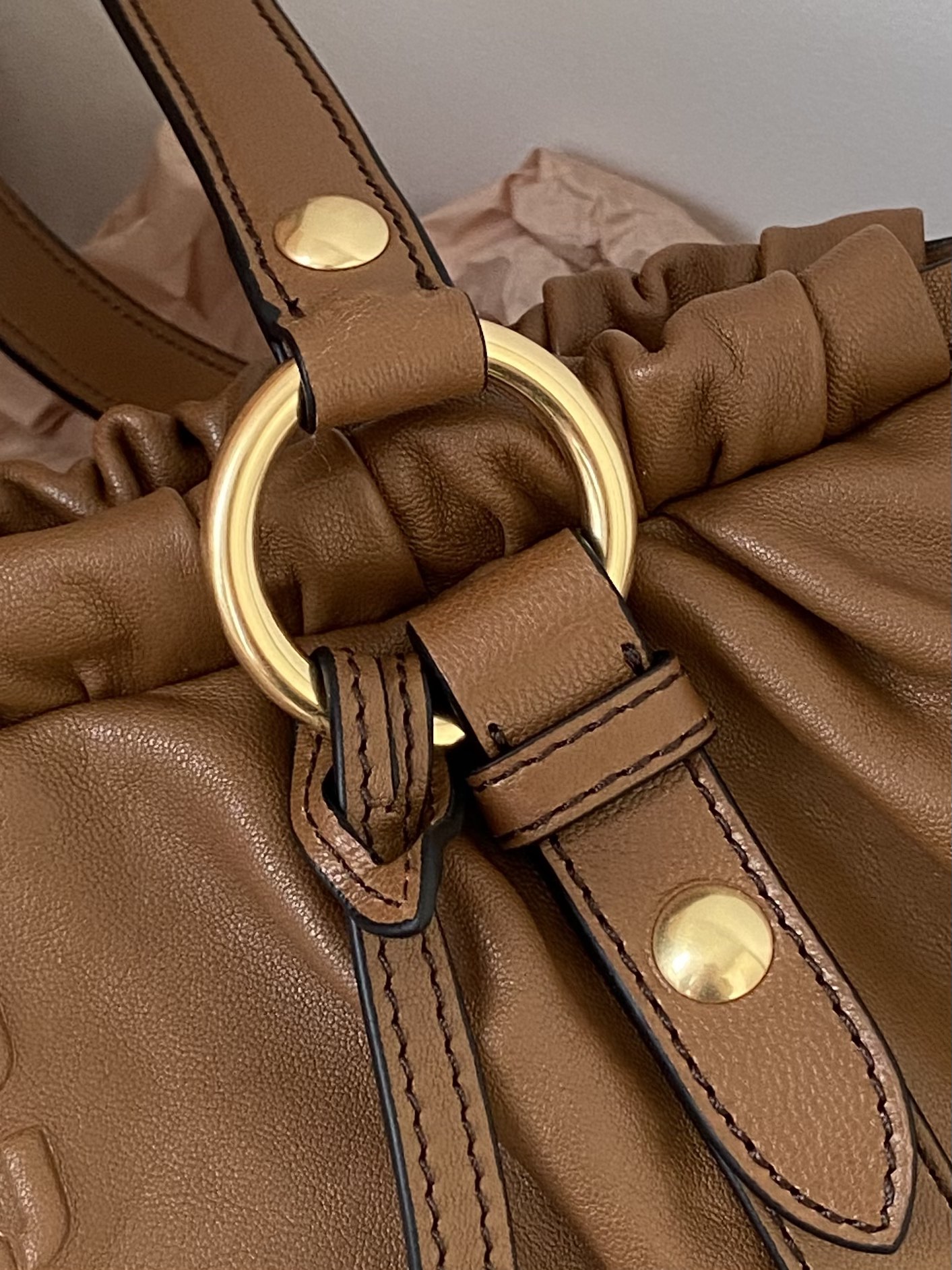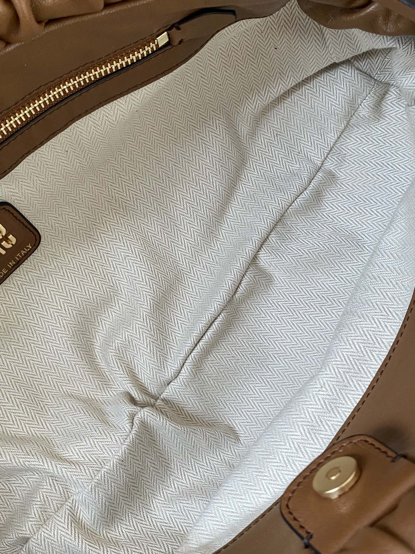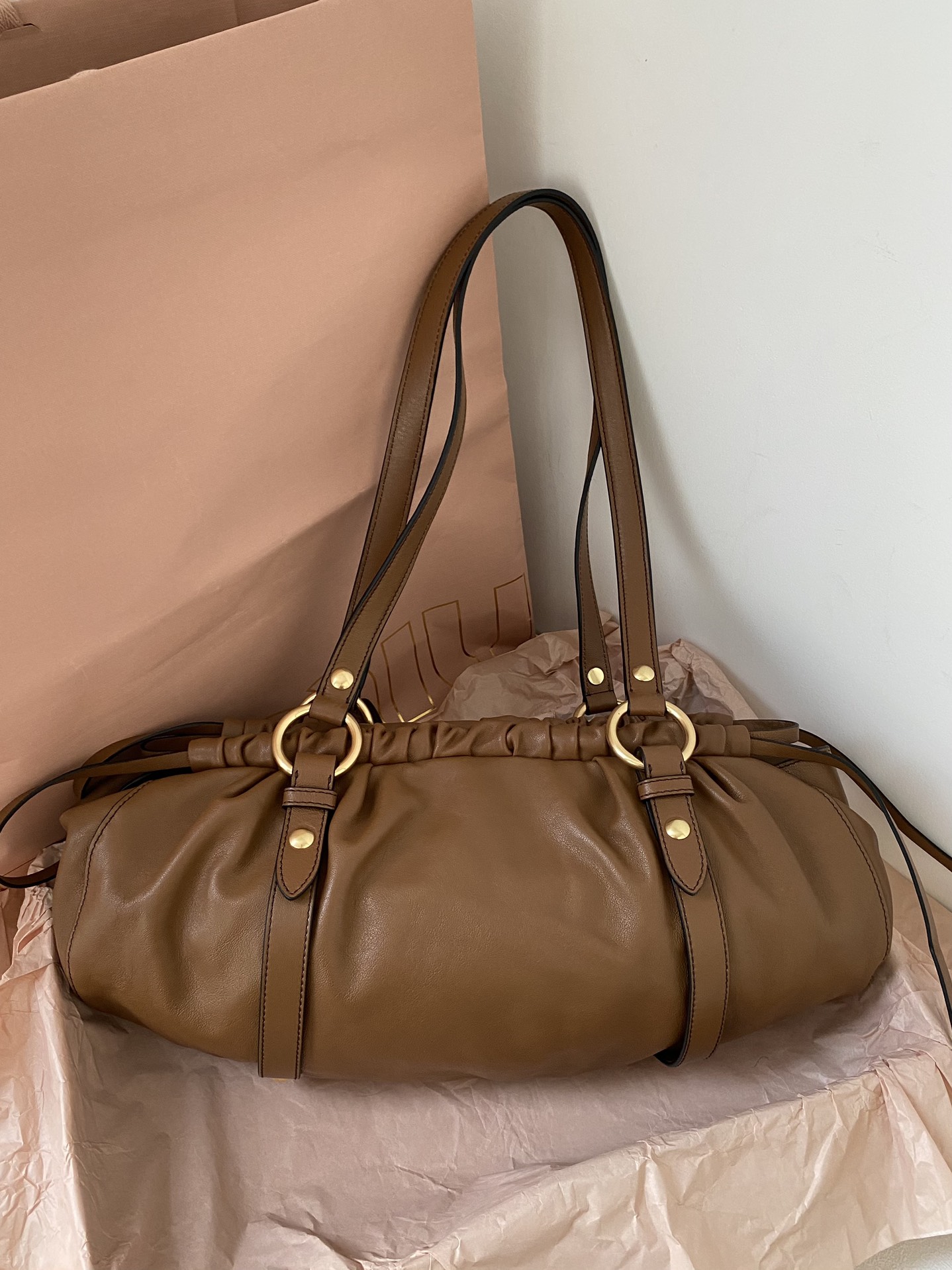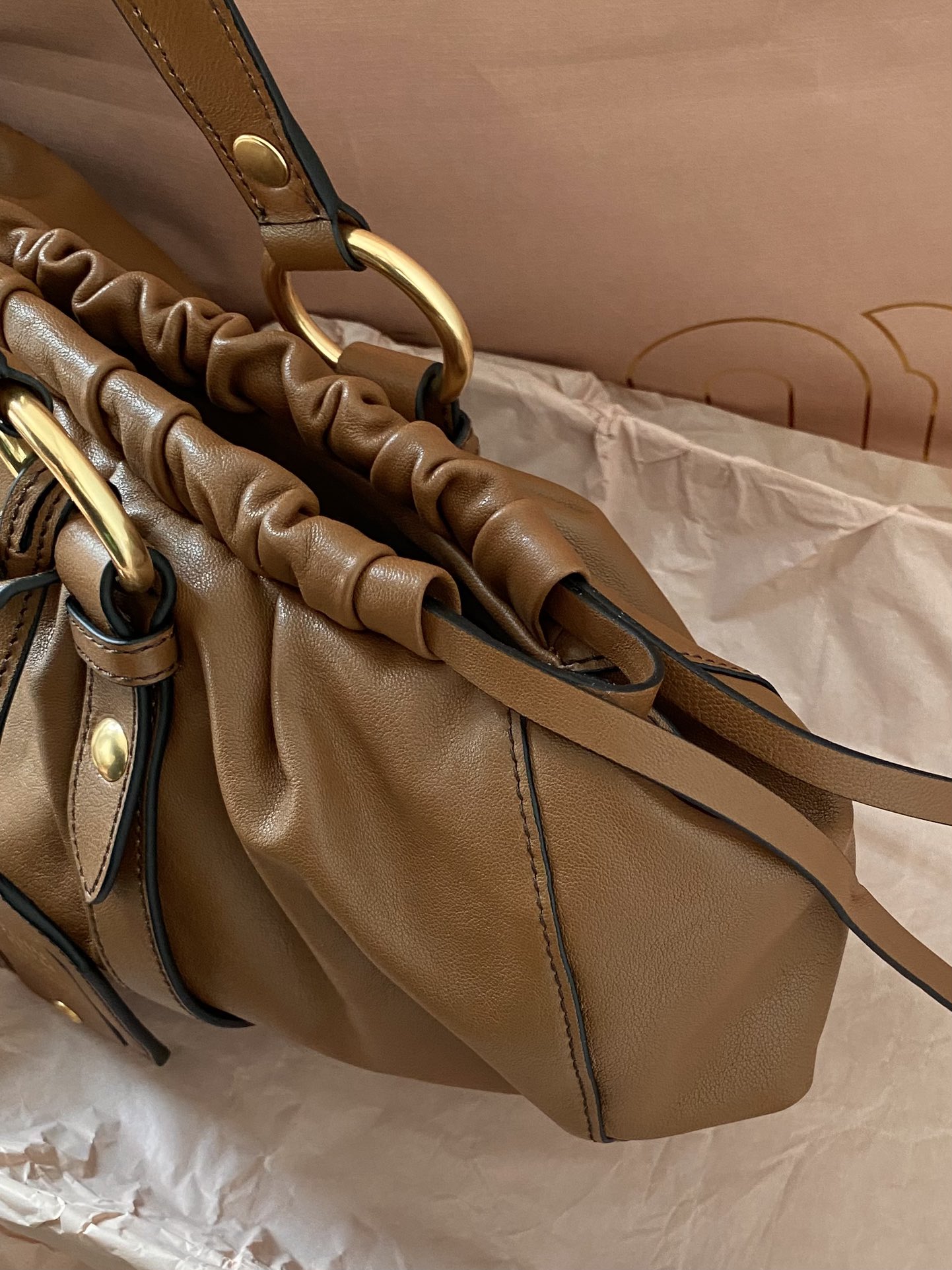 미우미우 아르카디 마테라쎄 나파 가죽 백 캐러멜