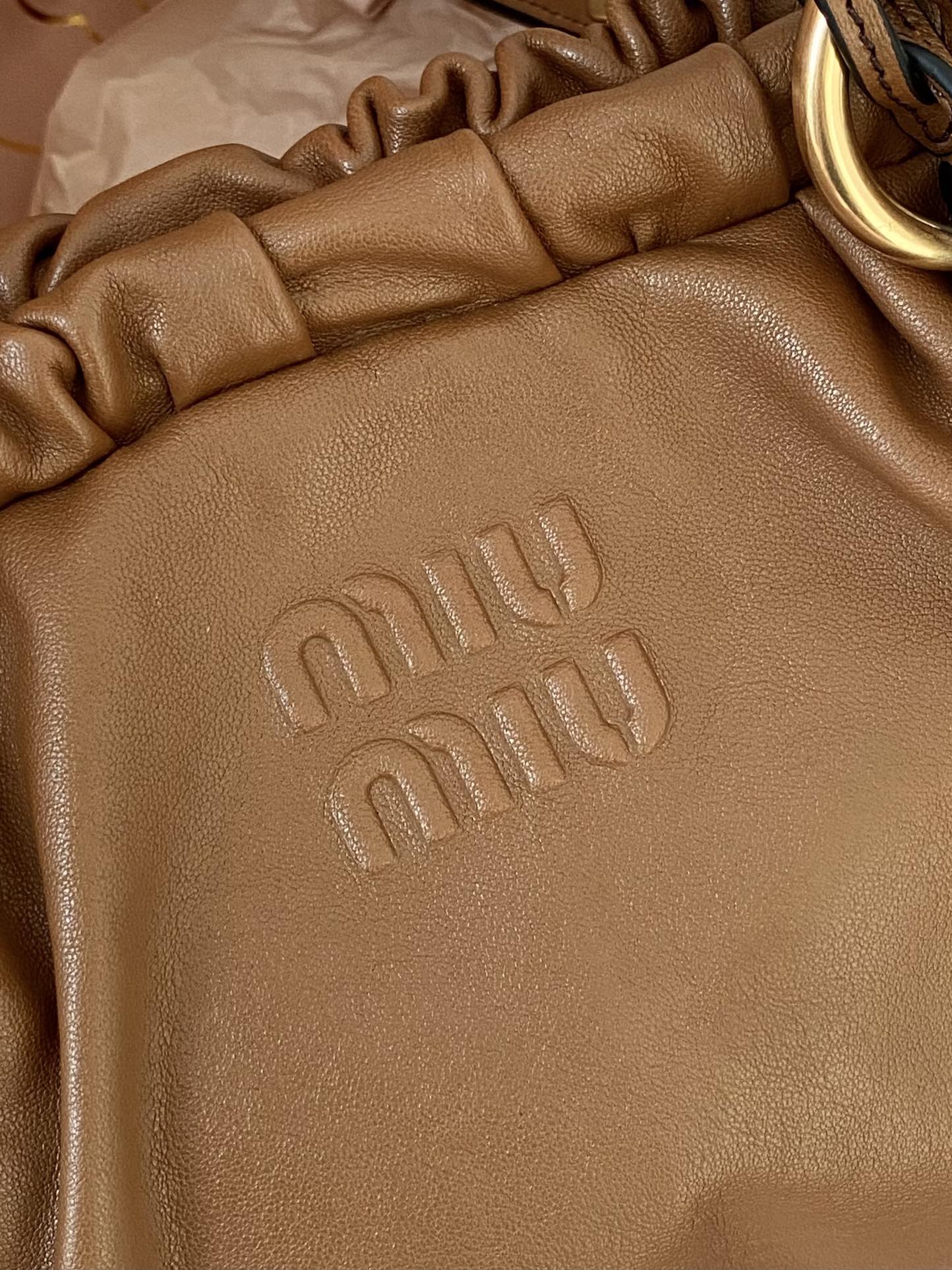 미우미우 나파 레더 숄더백 로고 샌드커피