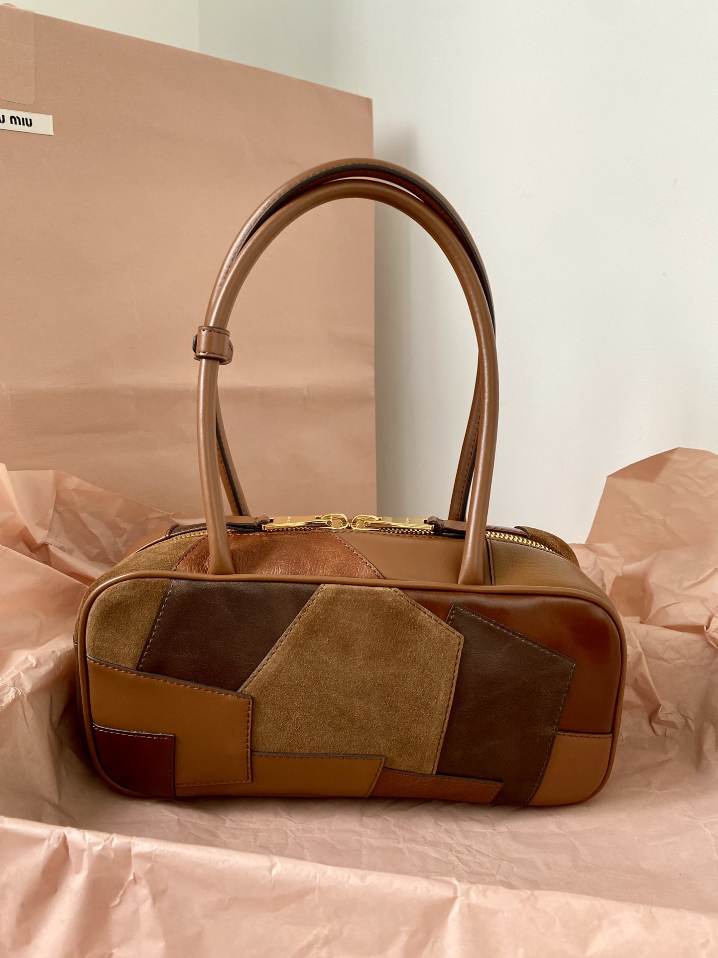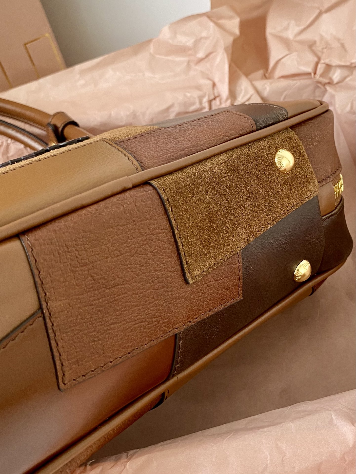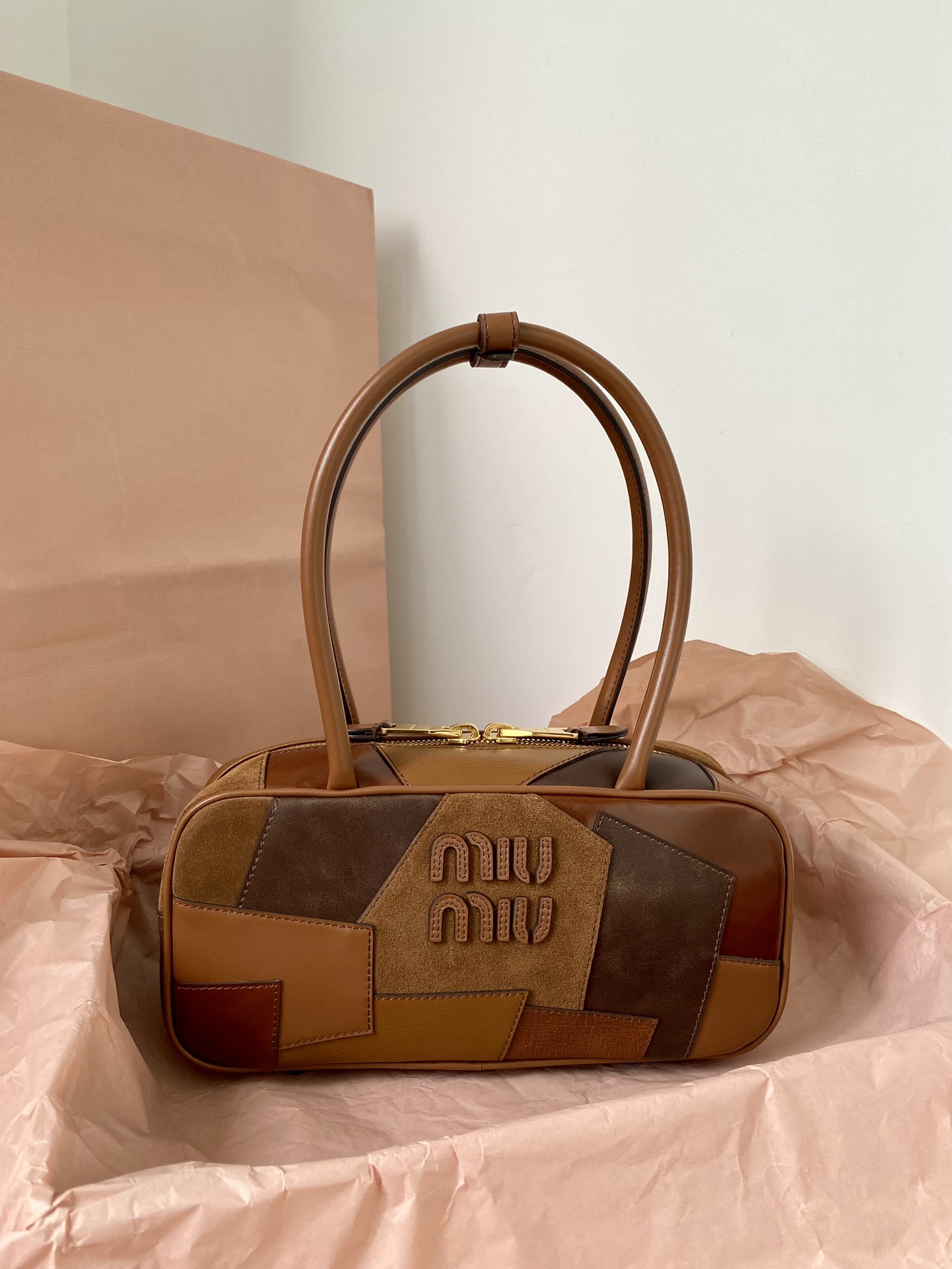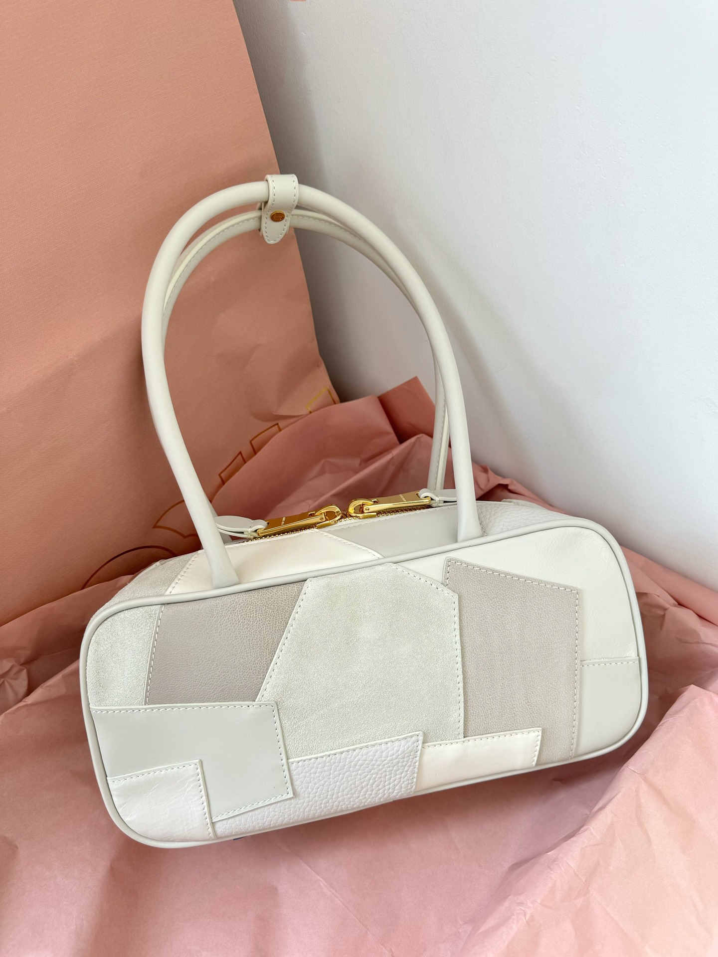 미우미우 아르카디 가죽 패치워크 백 (오크,화이트)