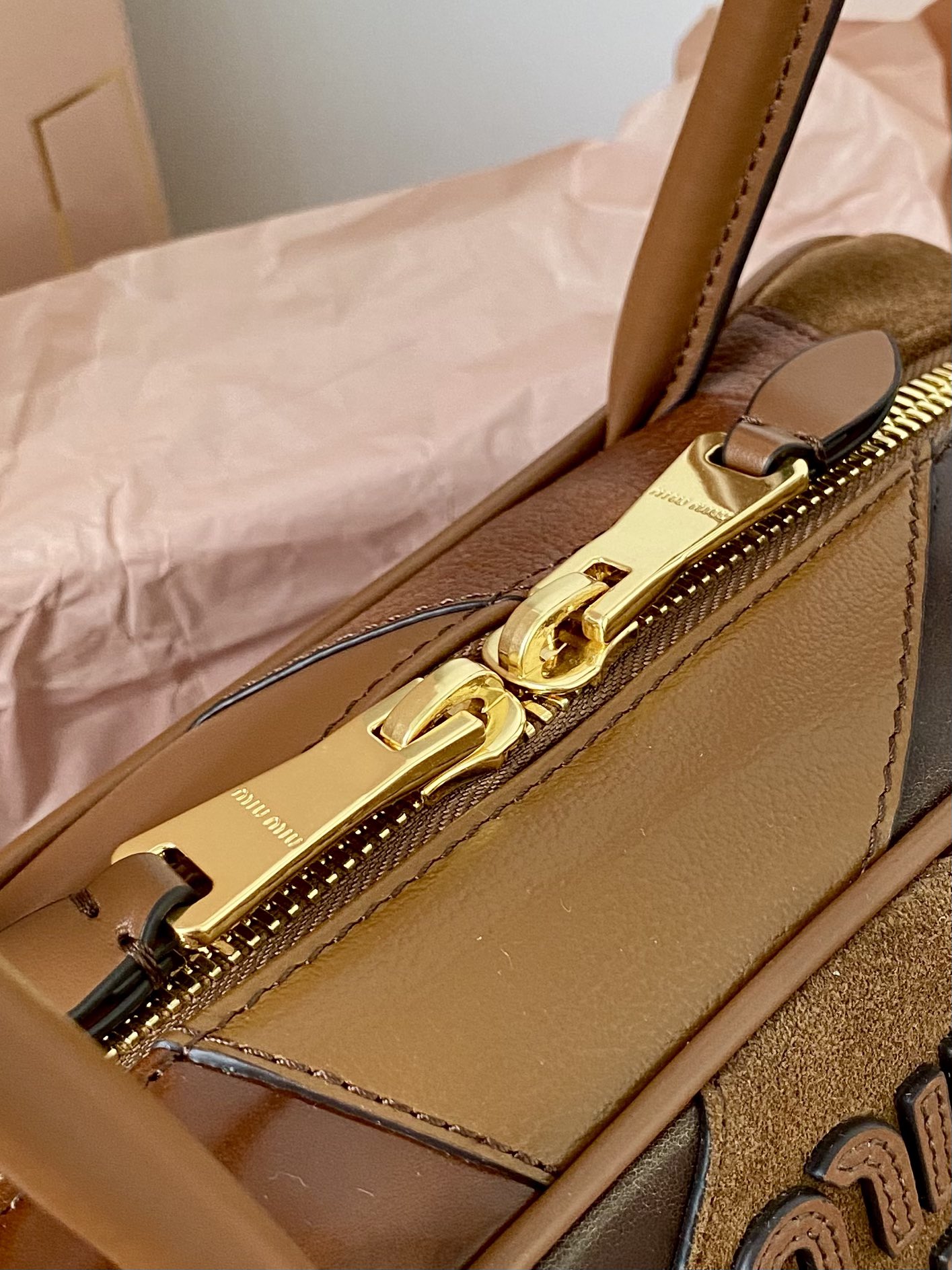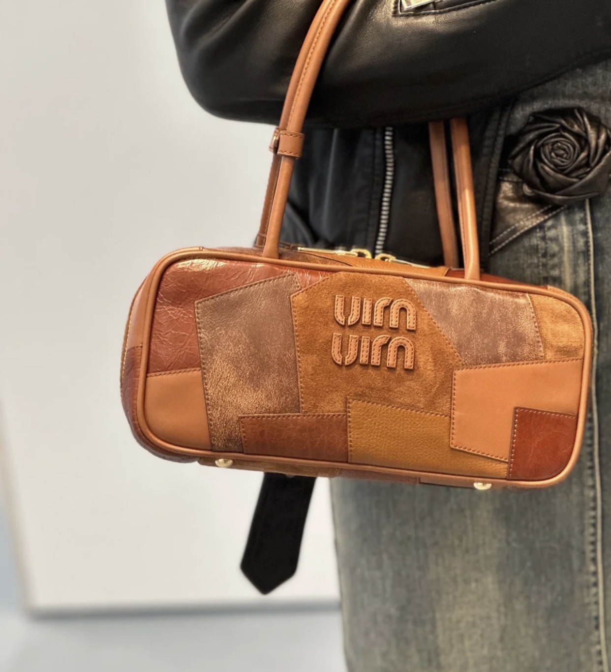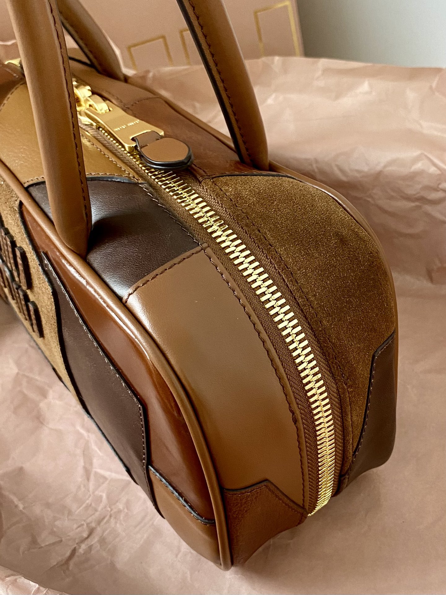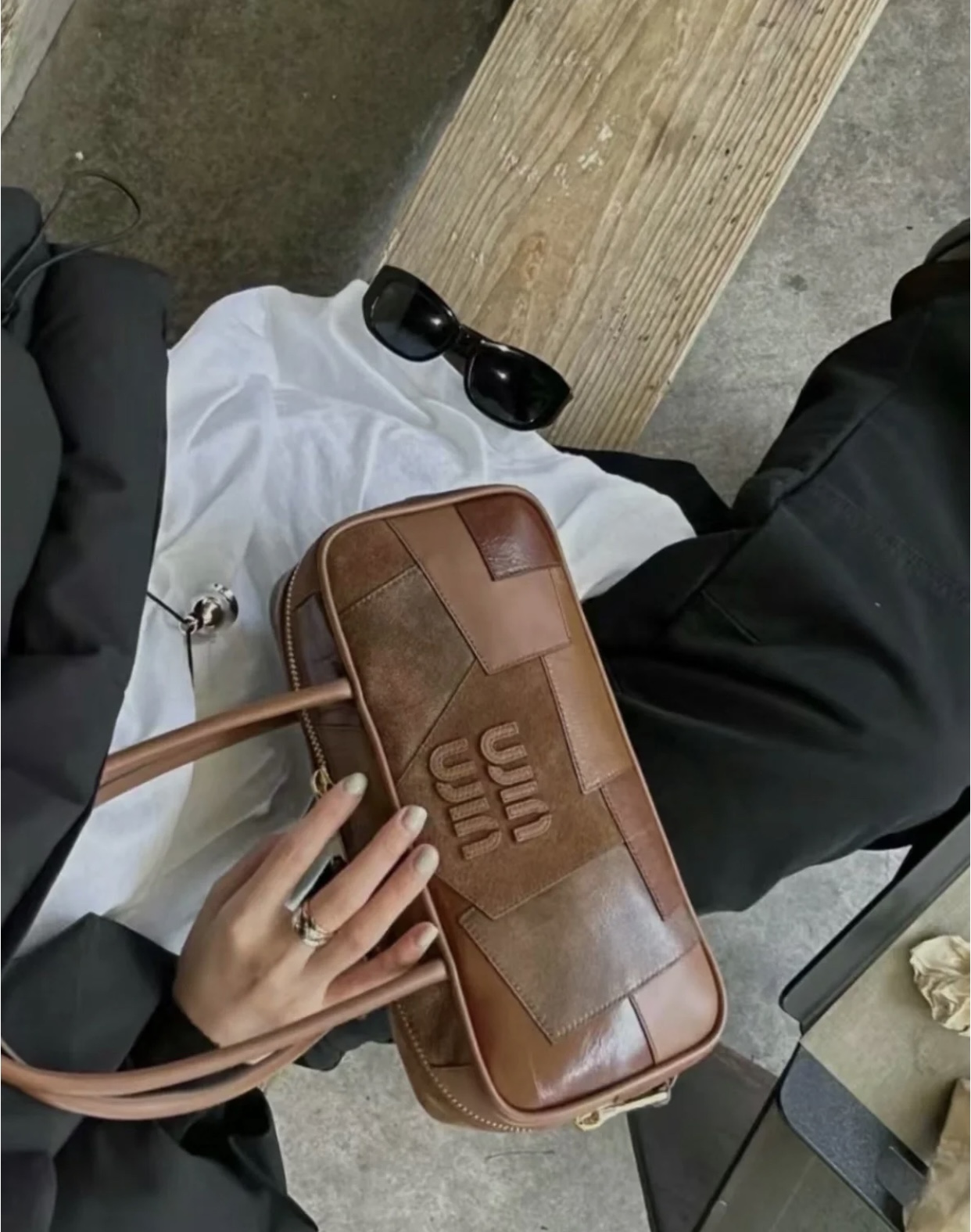 미우미우 아르카디 가죽 패치워크 백 (오크,화이트)
