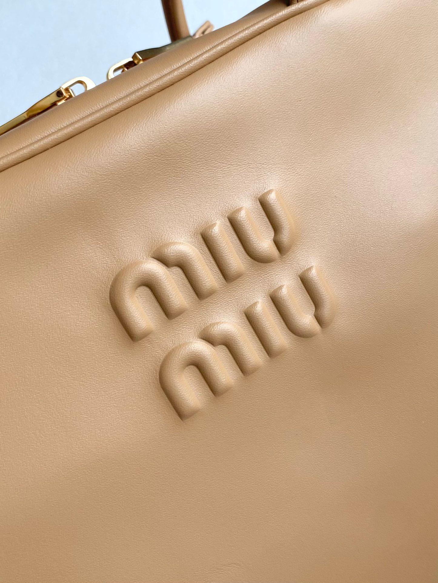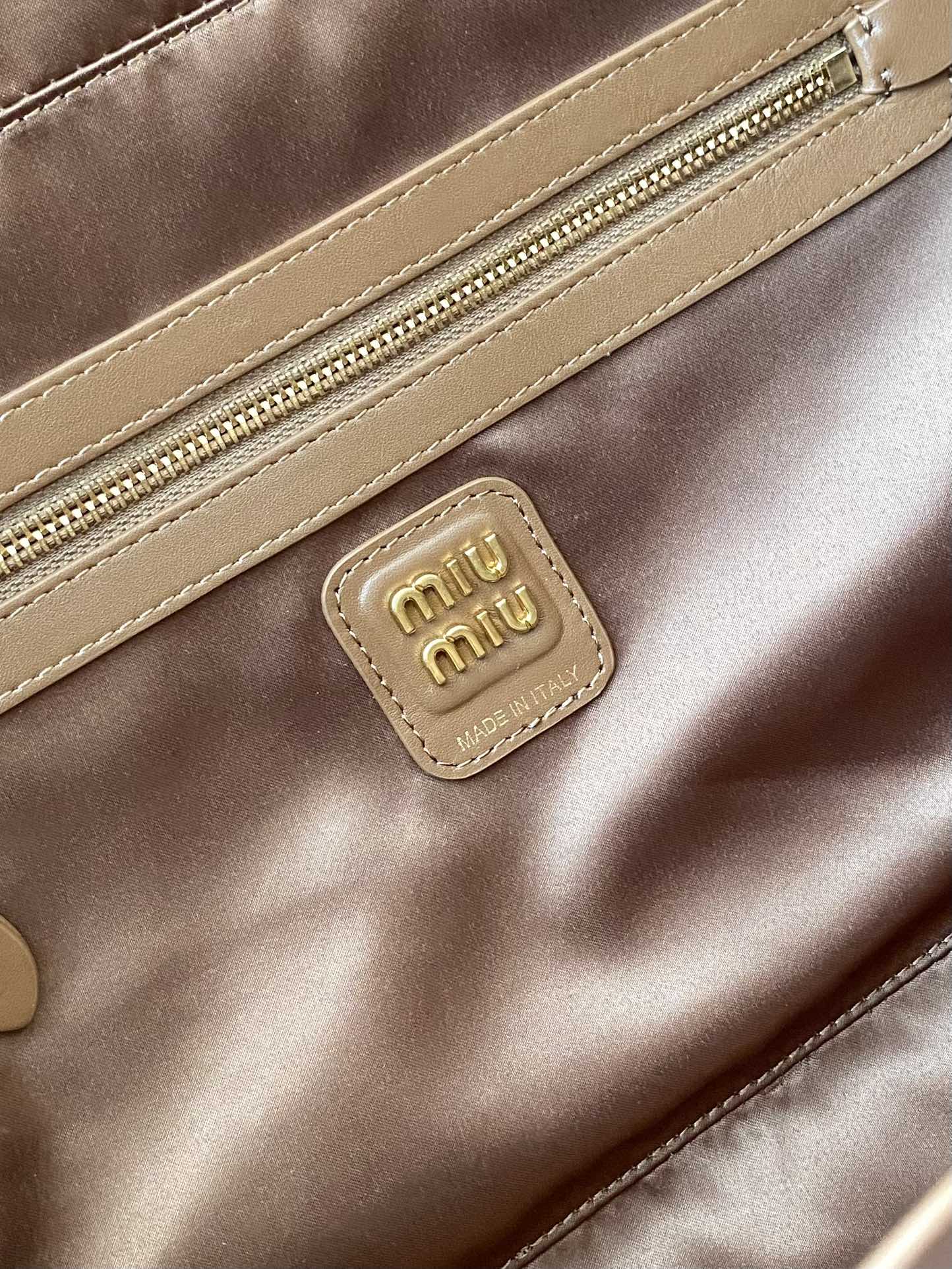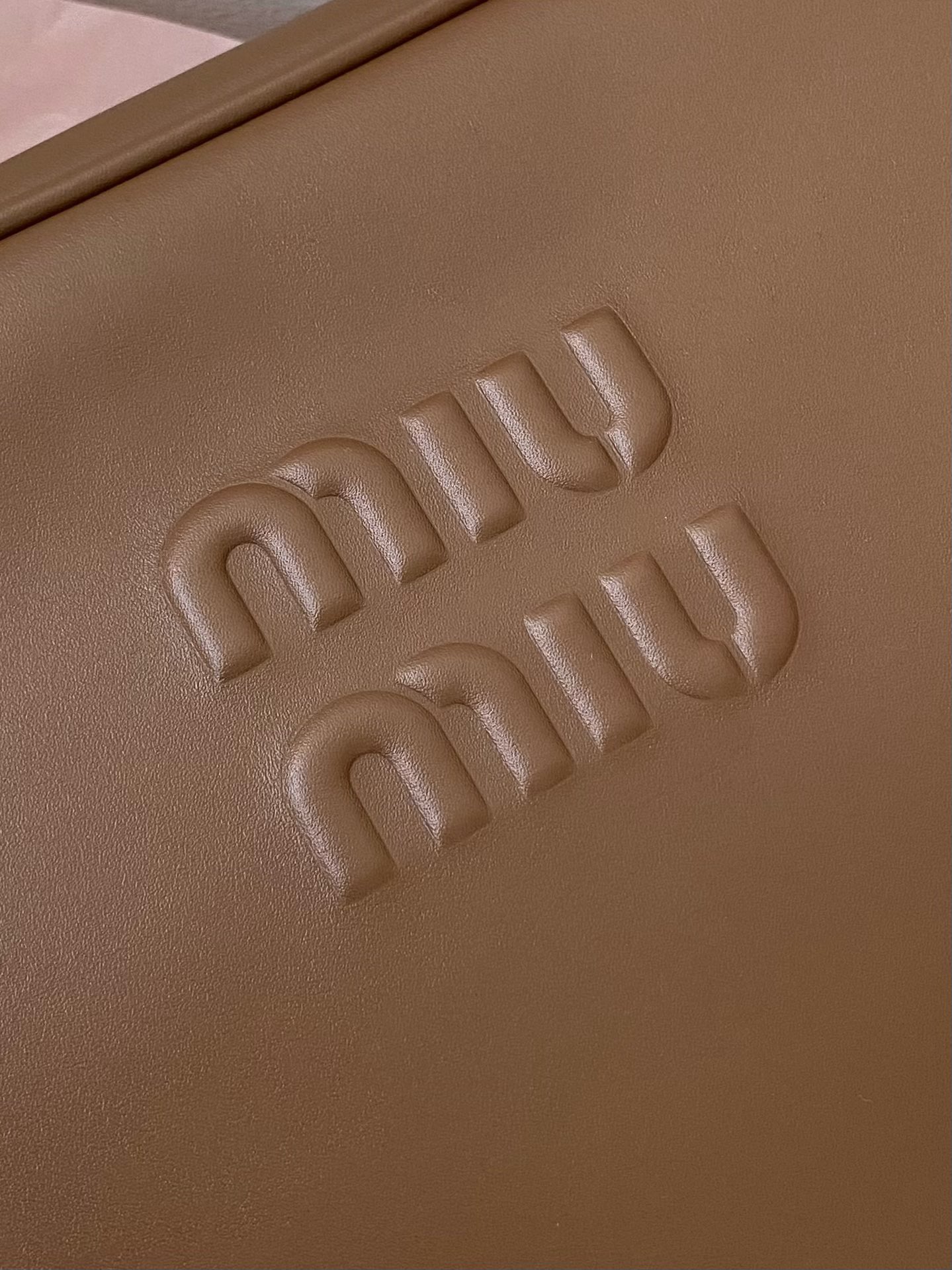 미우미우 나파 레더 숄더백 로고 샌드커피