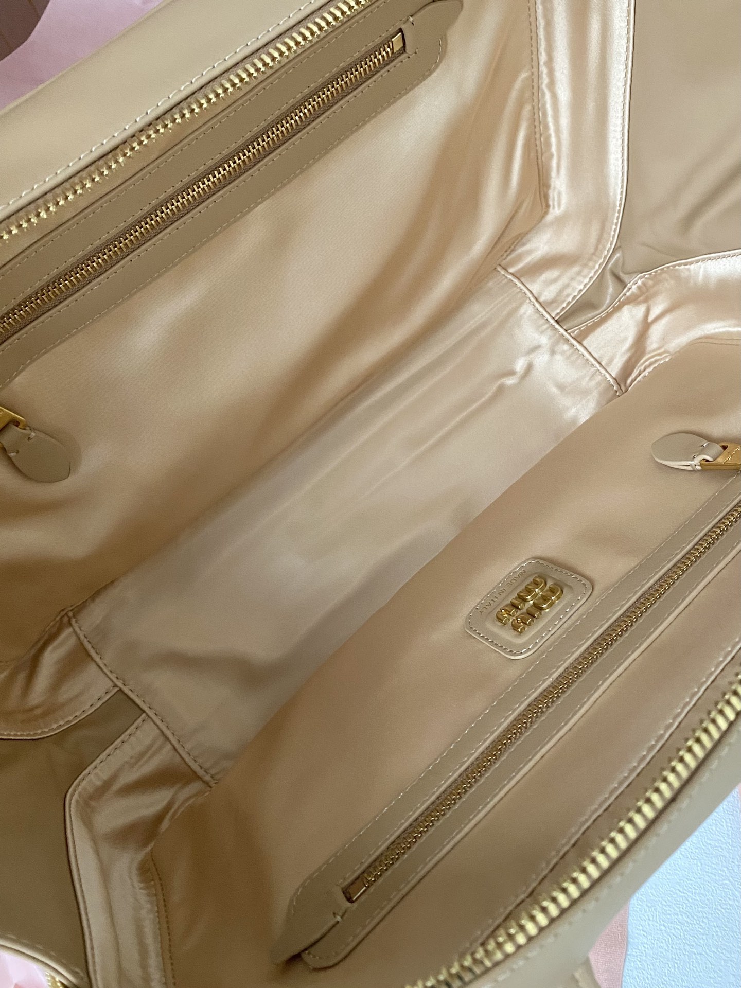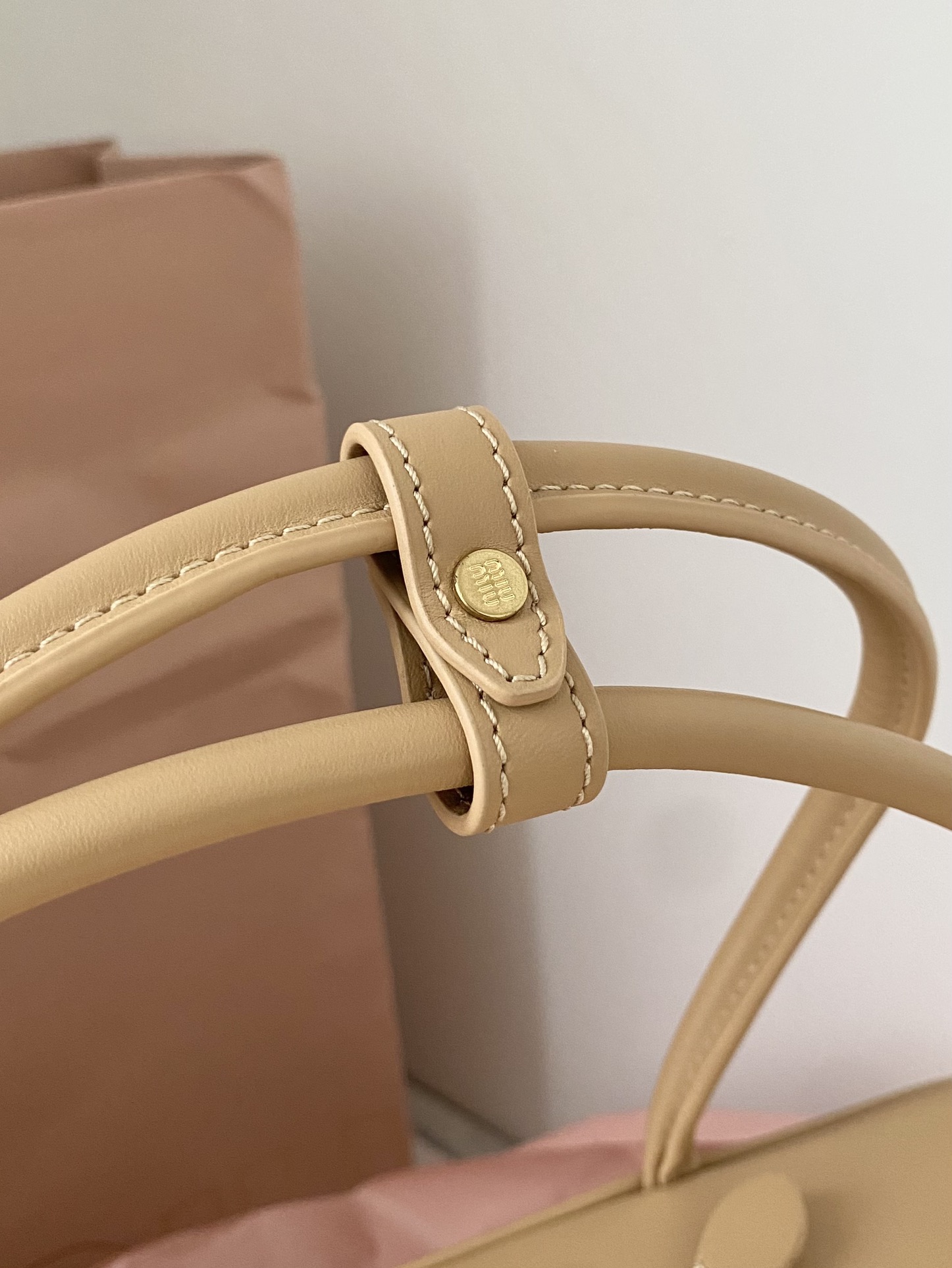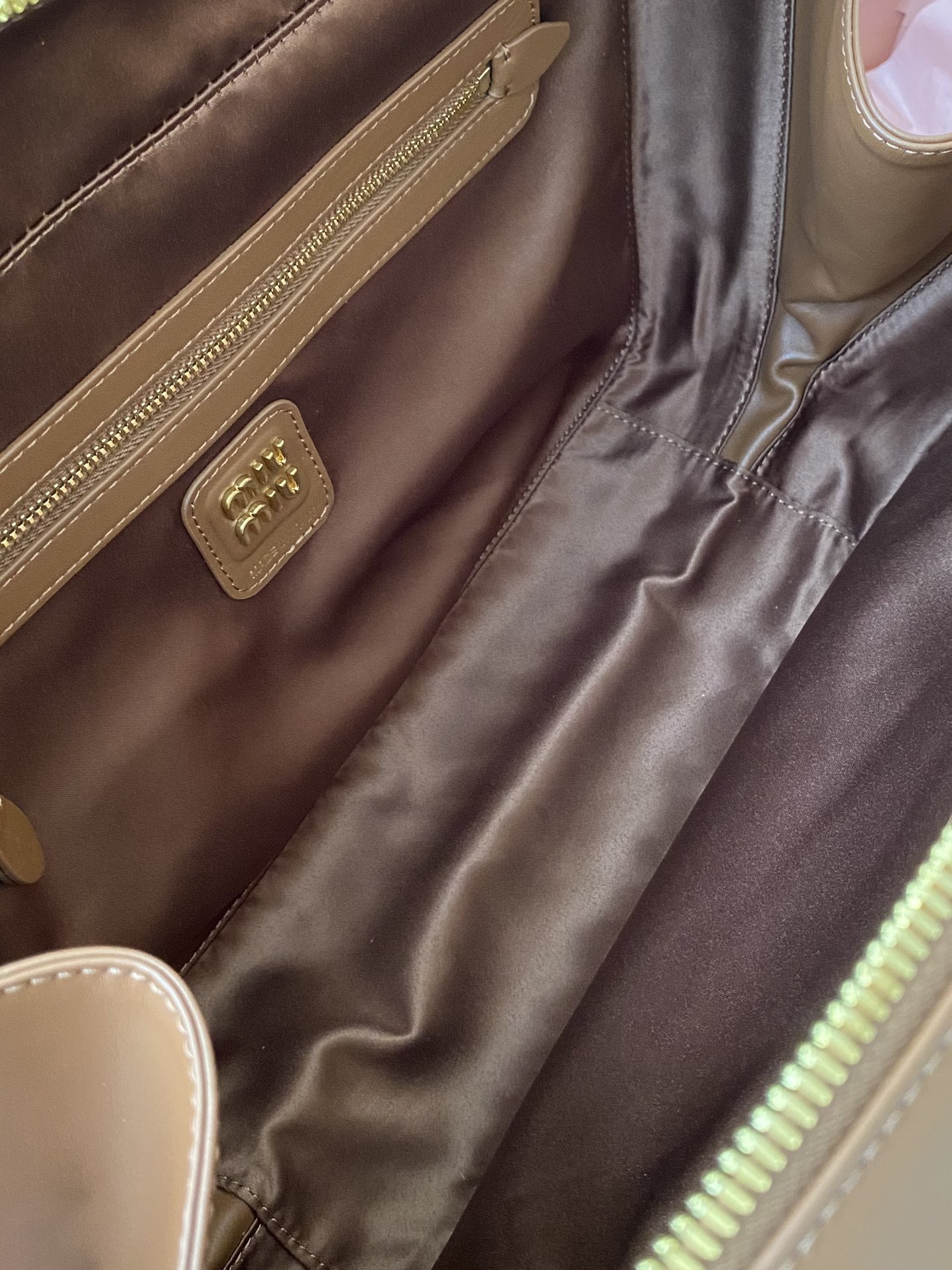 미우미우 나파 레더 숄더백 로고 샌드커피