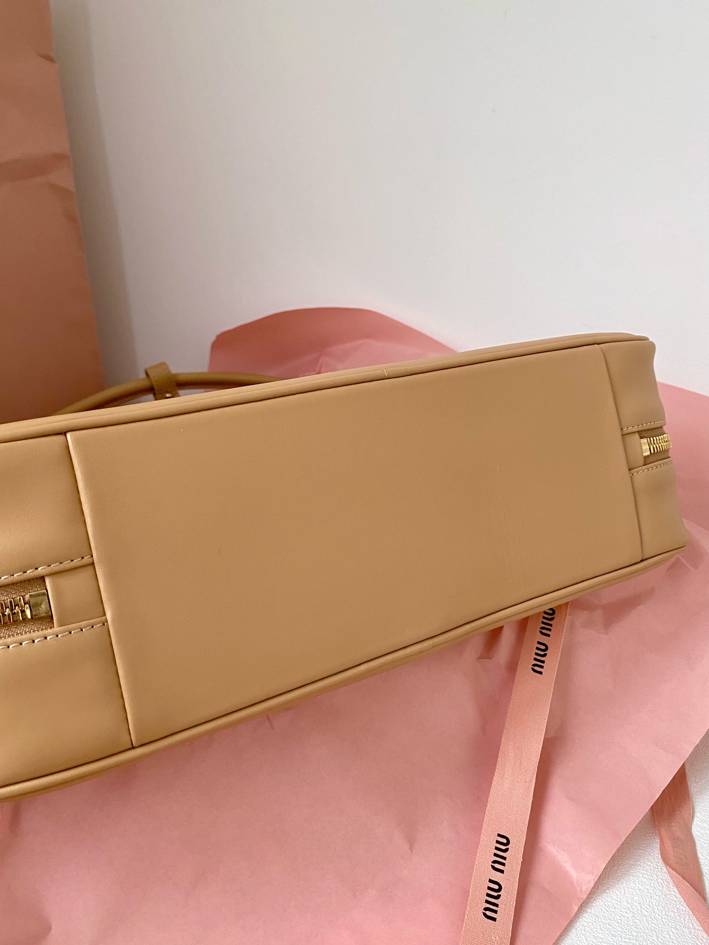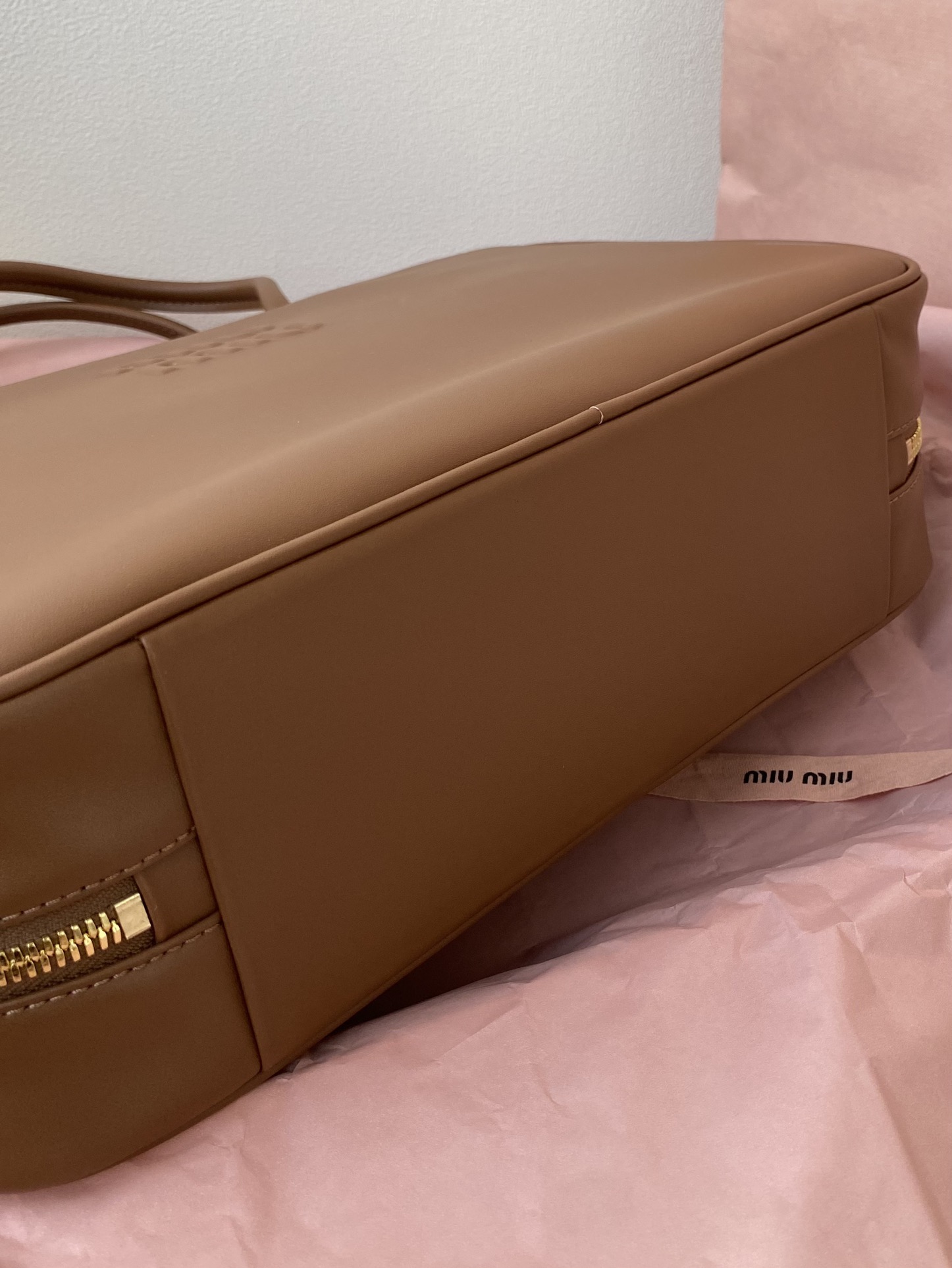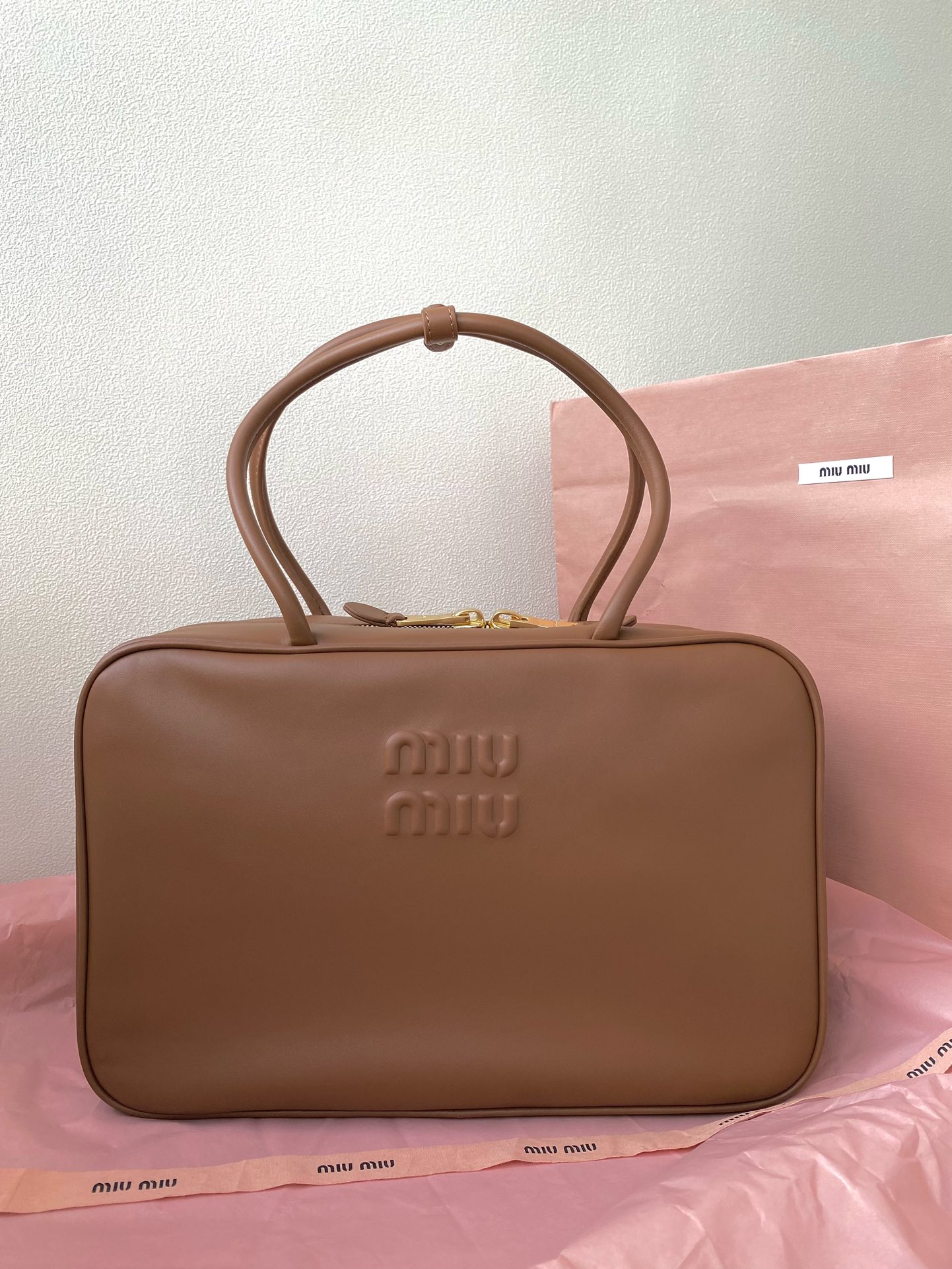 미우미우 아르카디 마테라쎄 나파 가죽 백 캐러멜