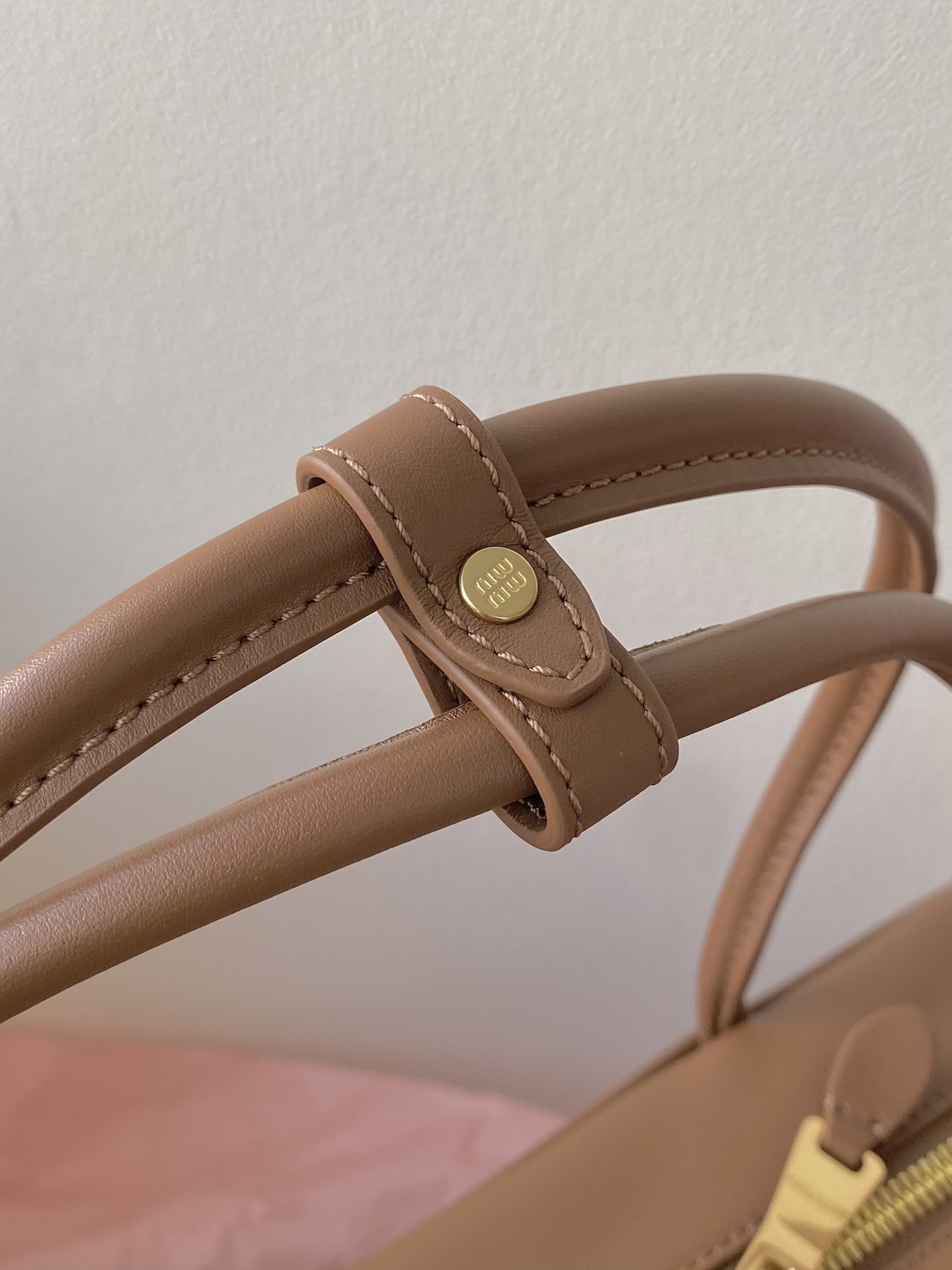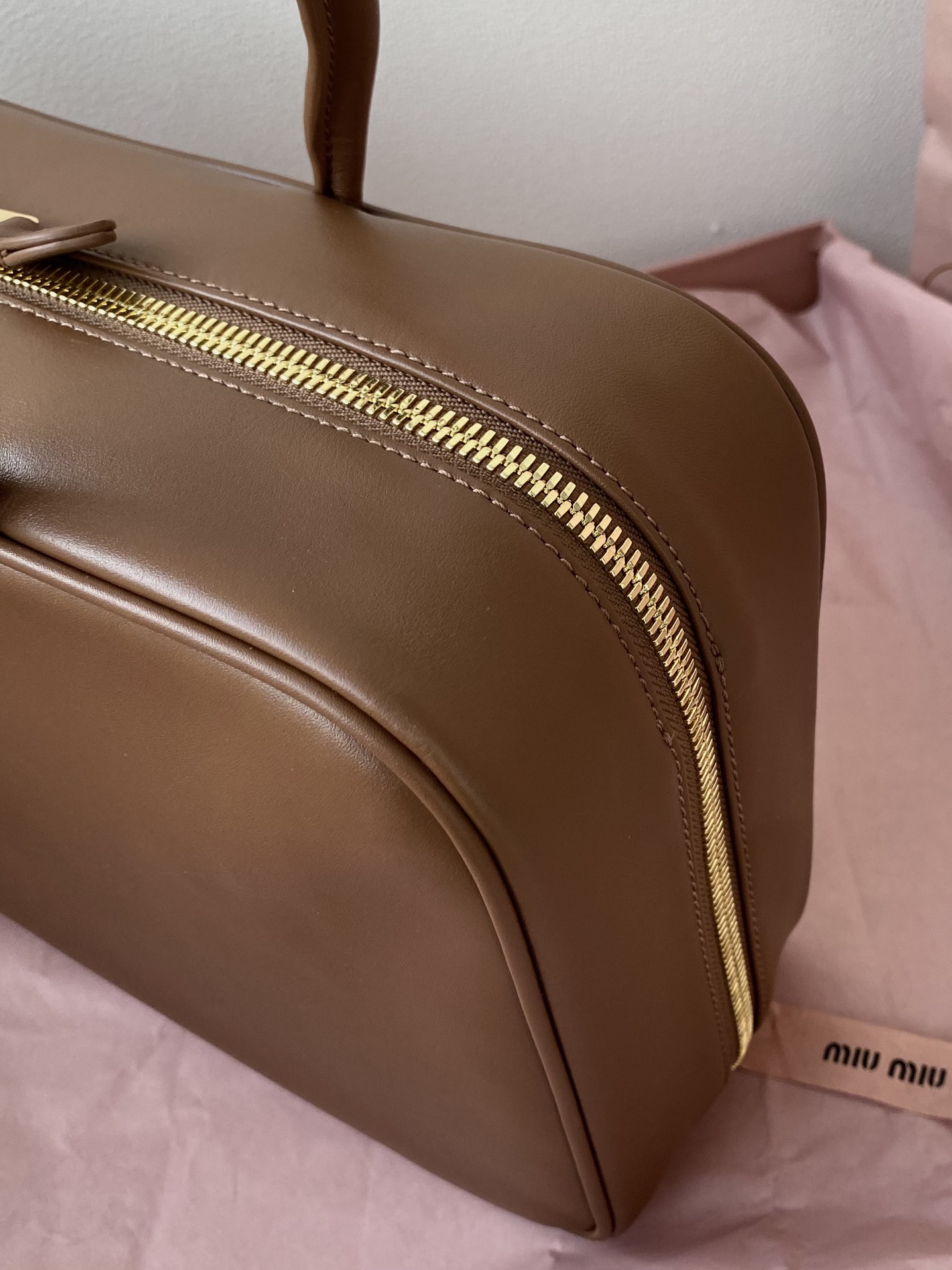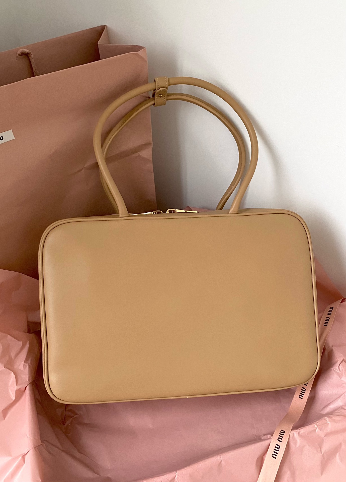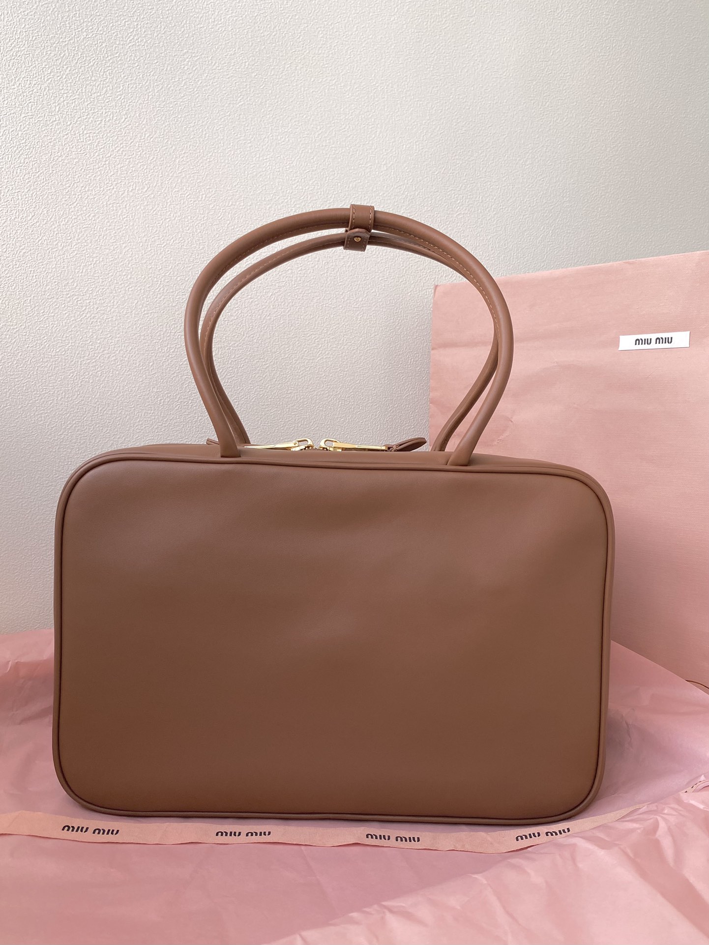 미우미우 아르카디 마테라쎄 나파 가죽 백 캐러멜