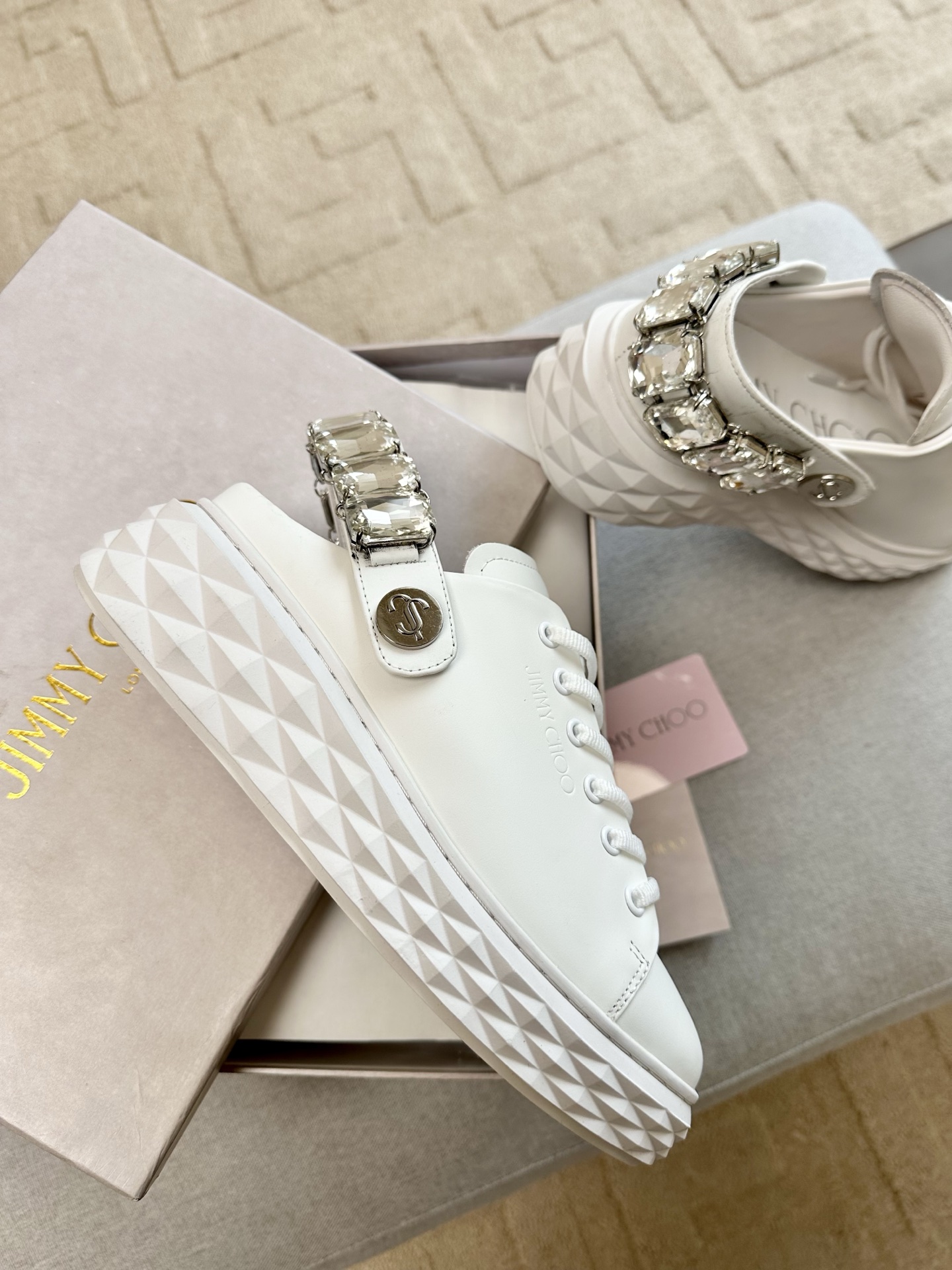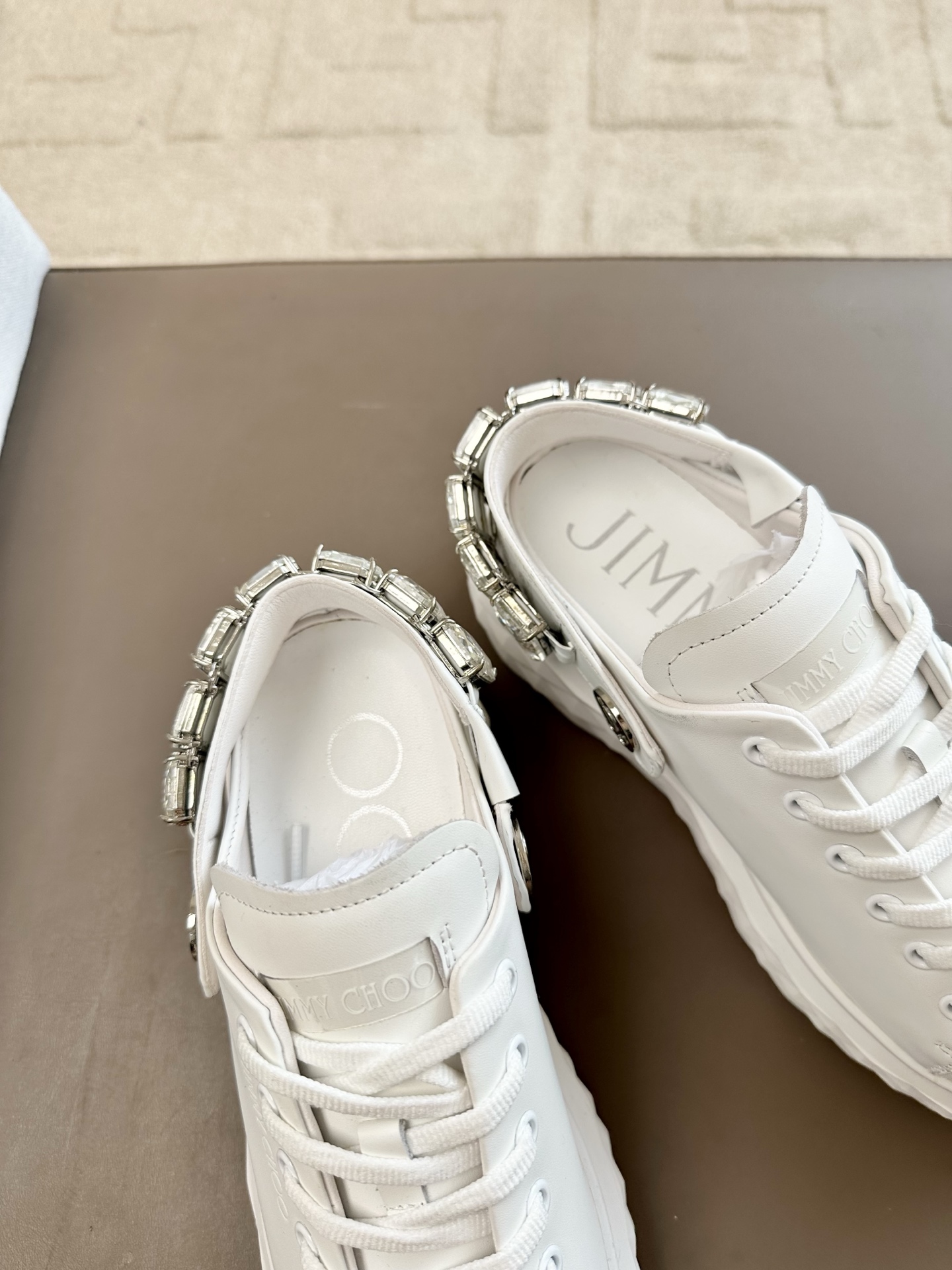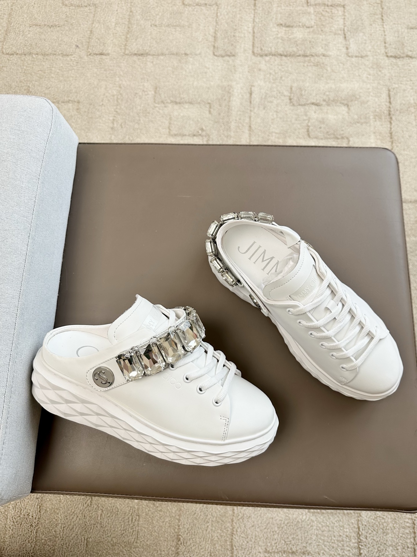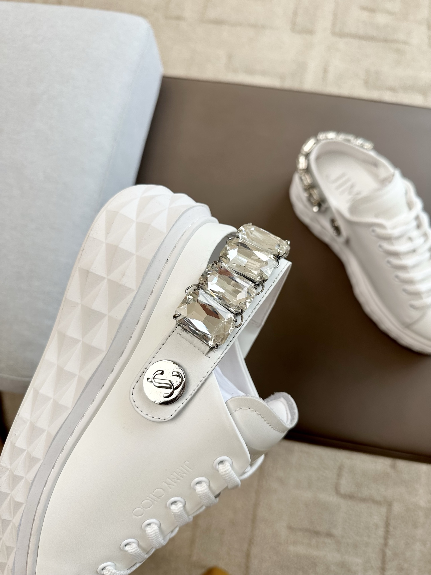 지미추 크리스털 스트랩 디테일 화이트 나파 가죽 슬리퍼 스니커즈