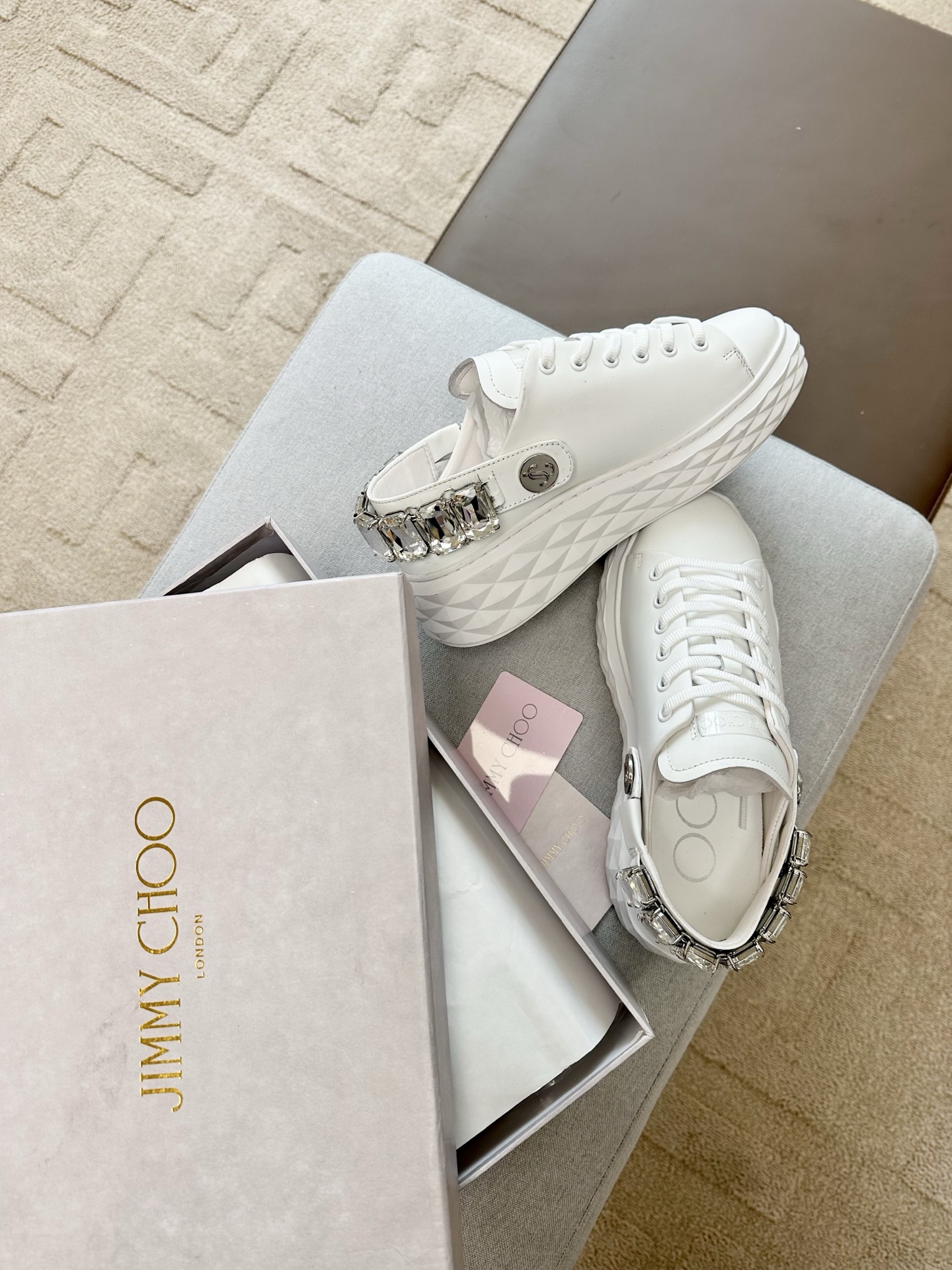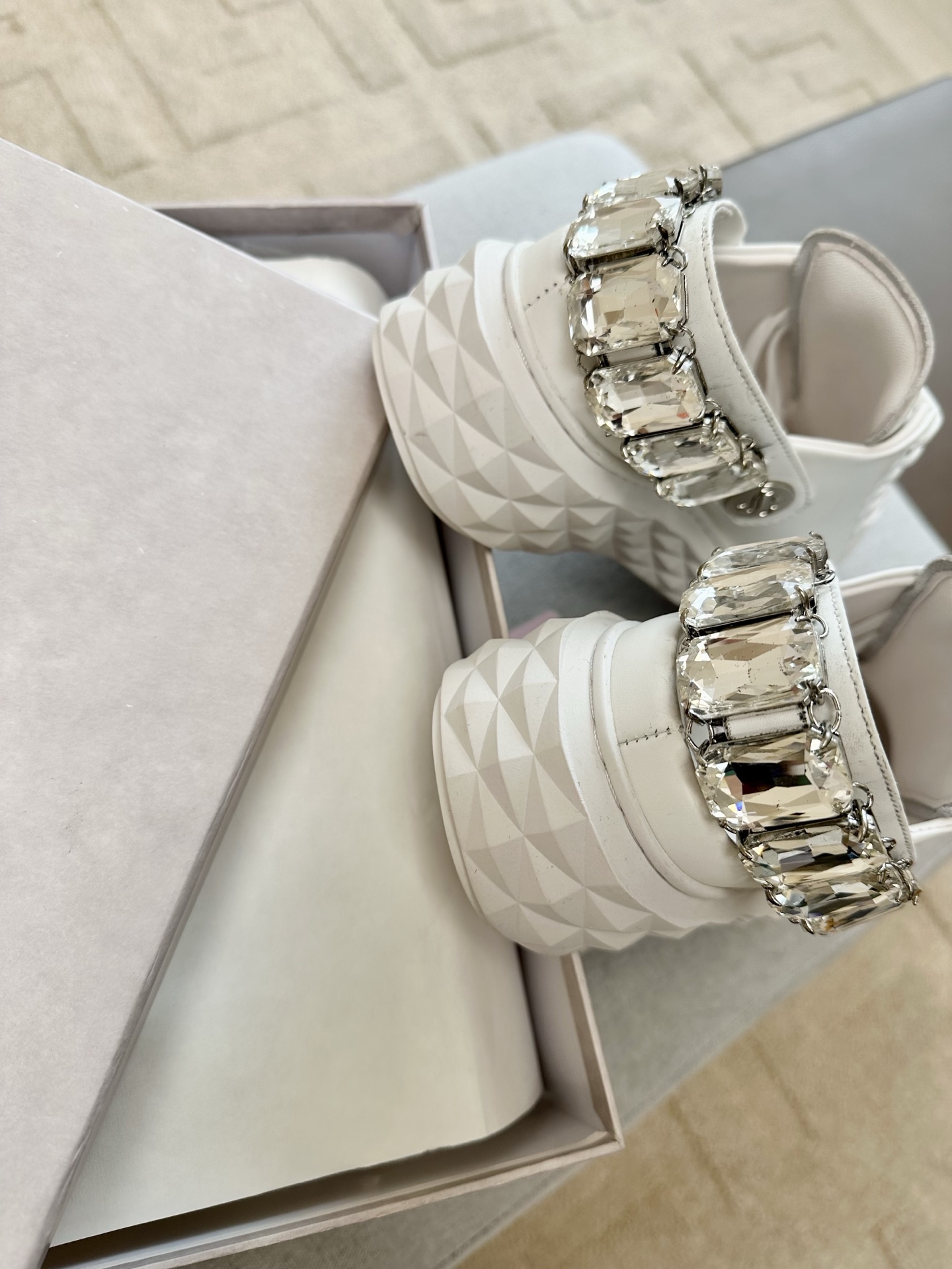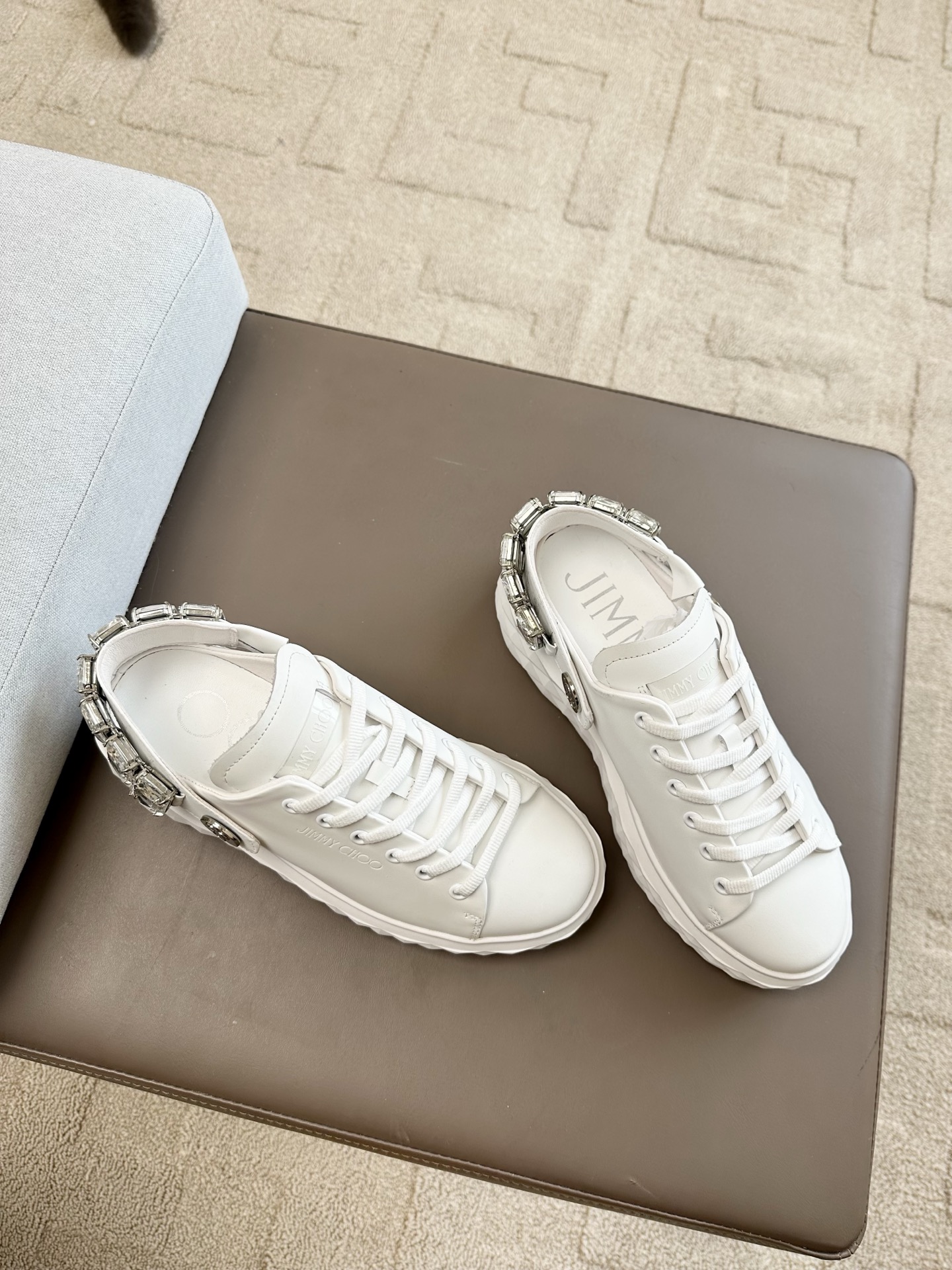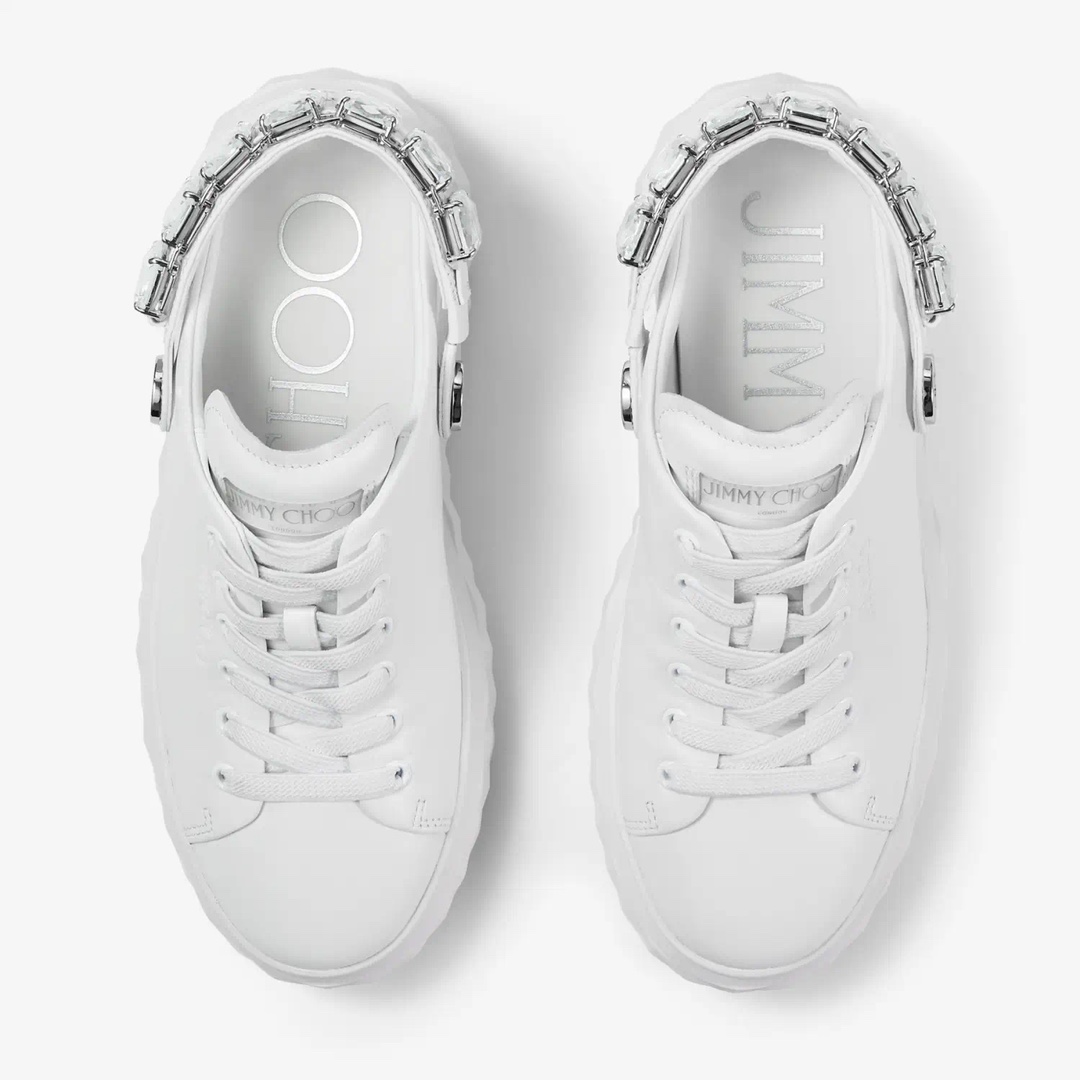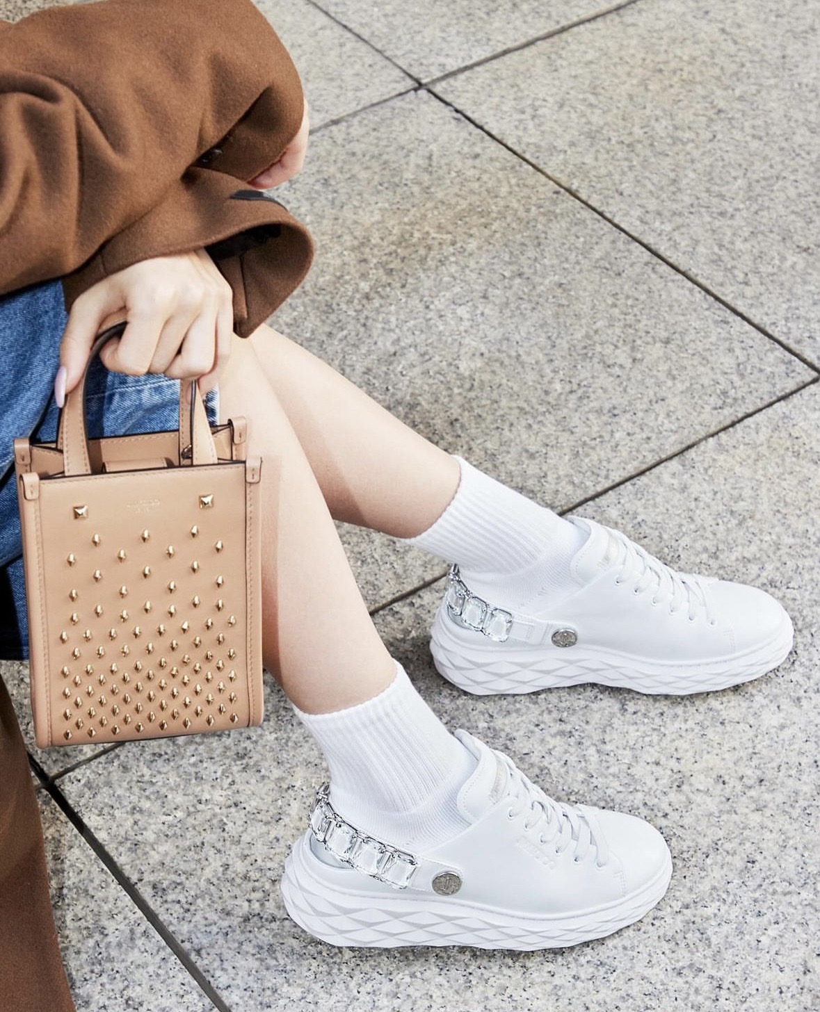 지미추 크리스털 스트랩 디테일 화이트 나파 가죽 슬리퍼 스니커즈