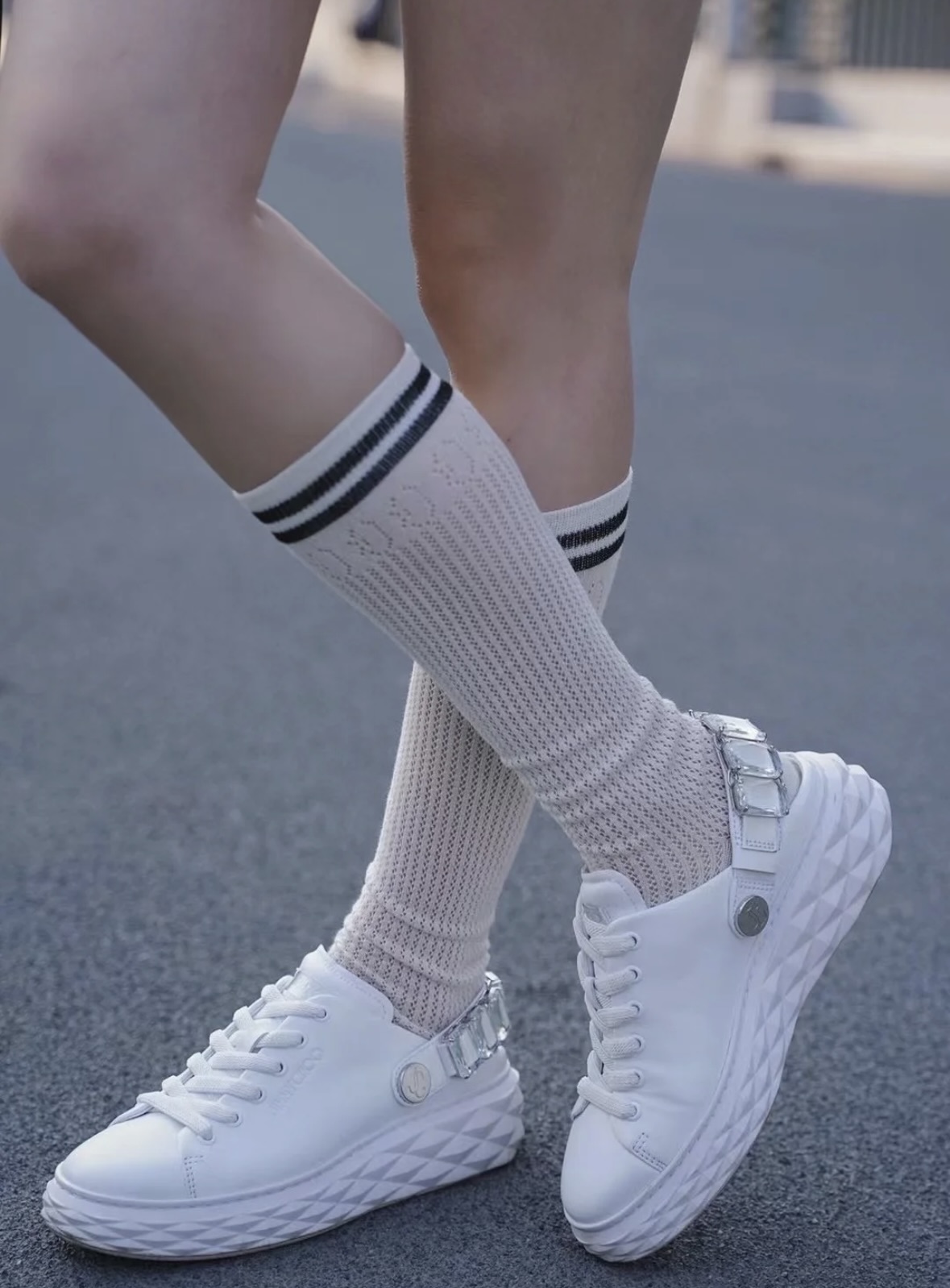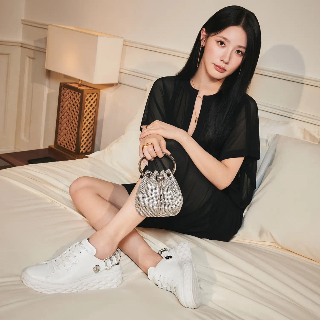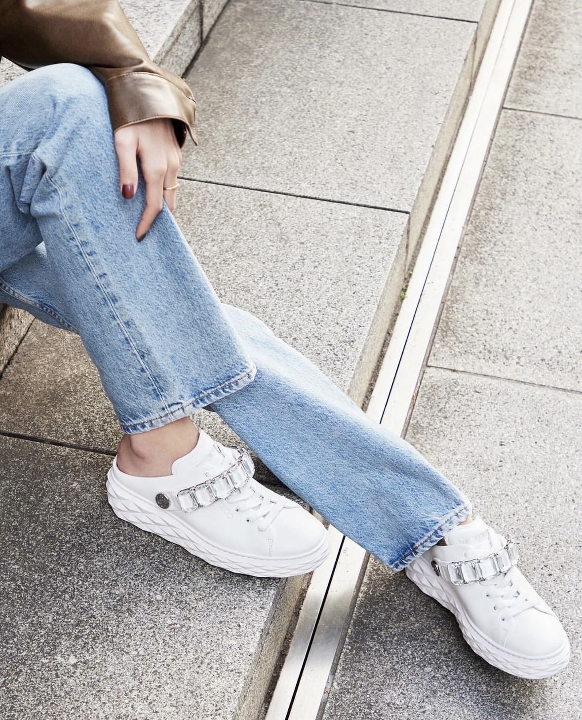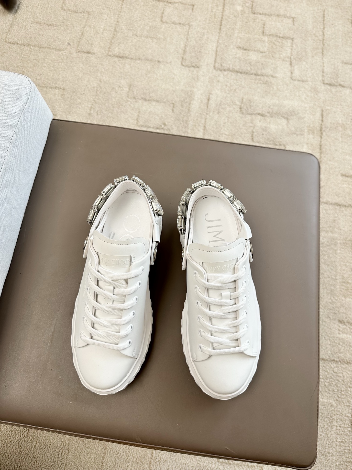 지미추 크리스털 스트랩 디테일 화이트 나파 가죽 슬리퍼 스니커즈