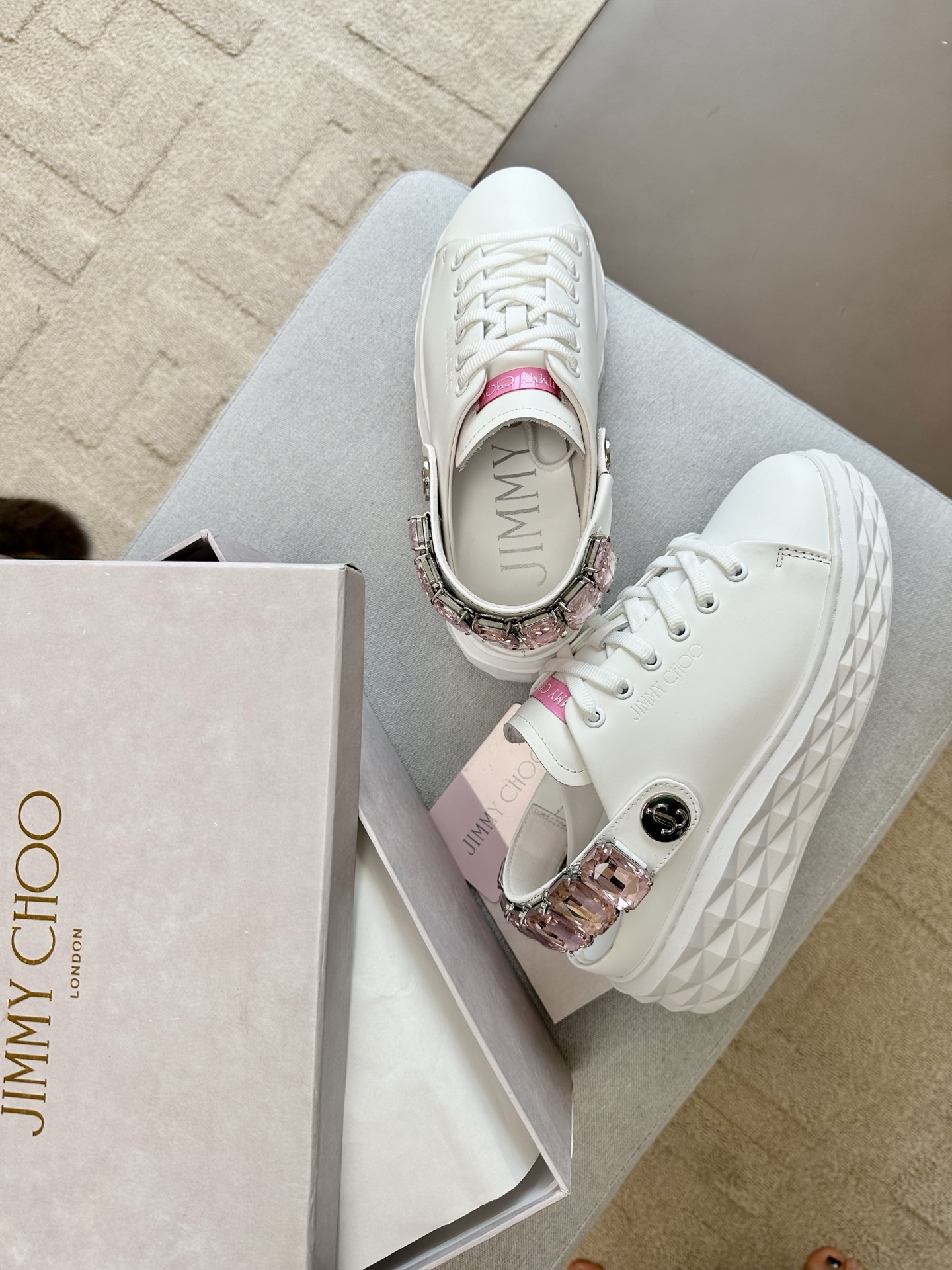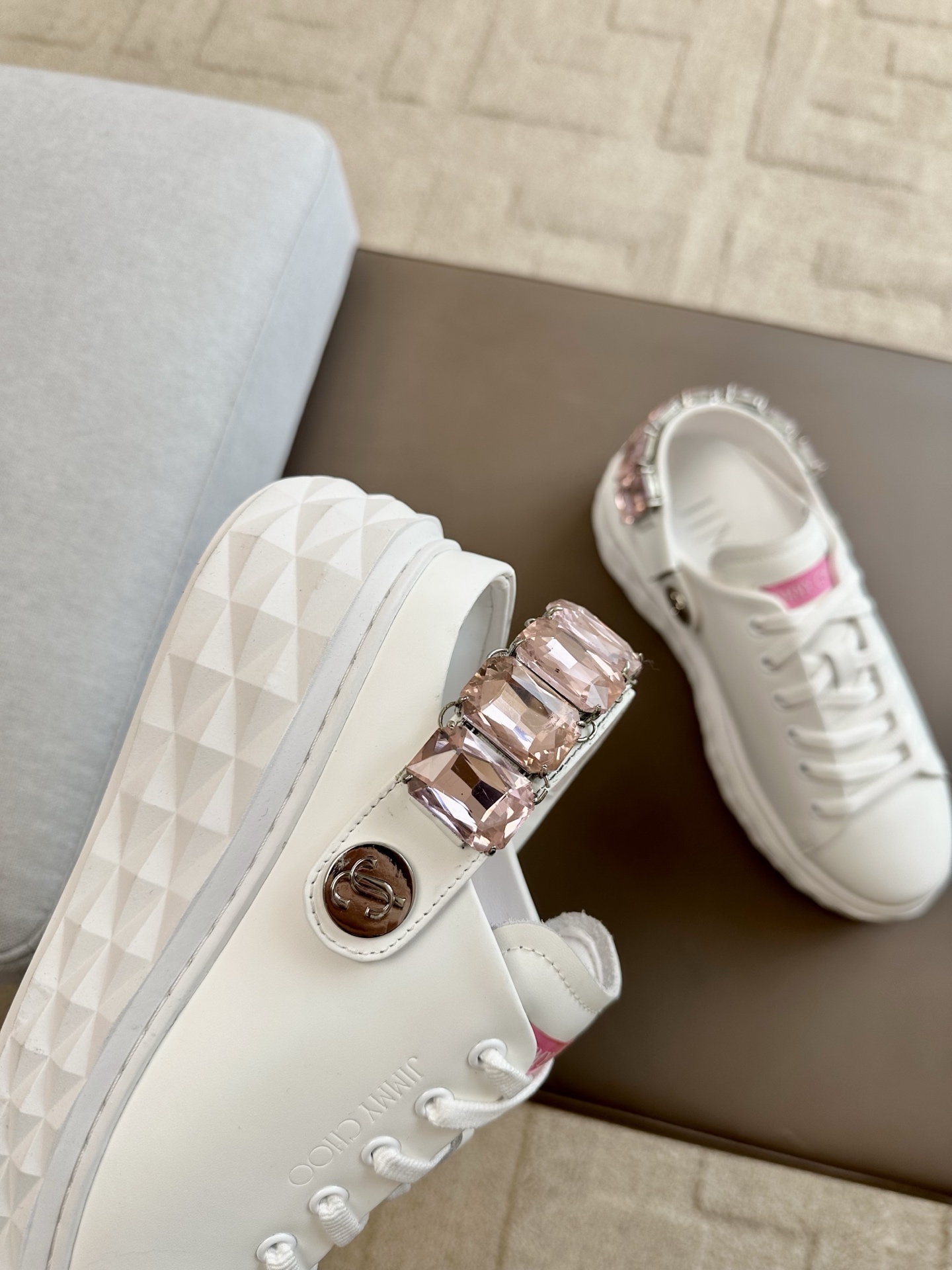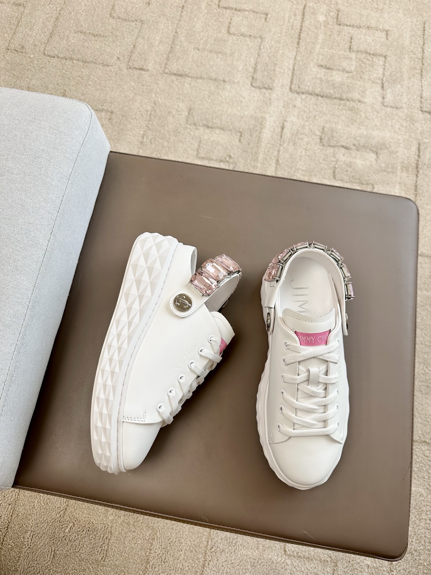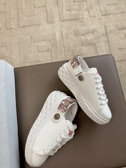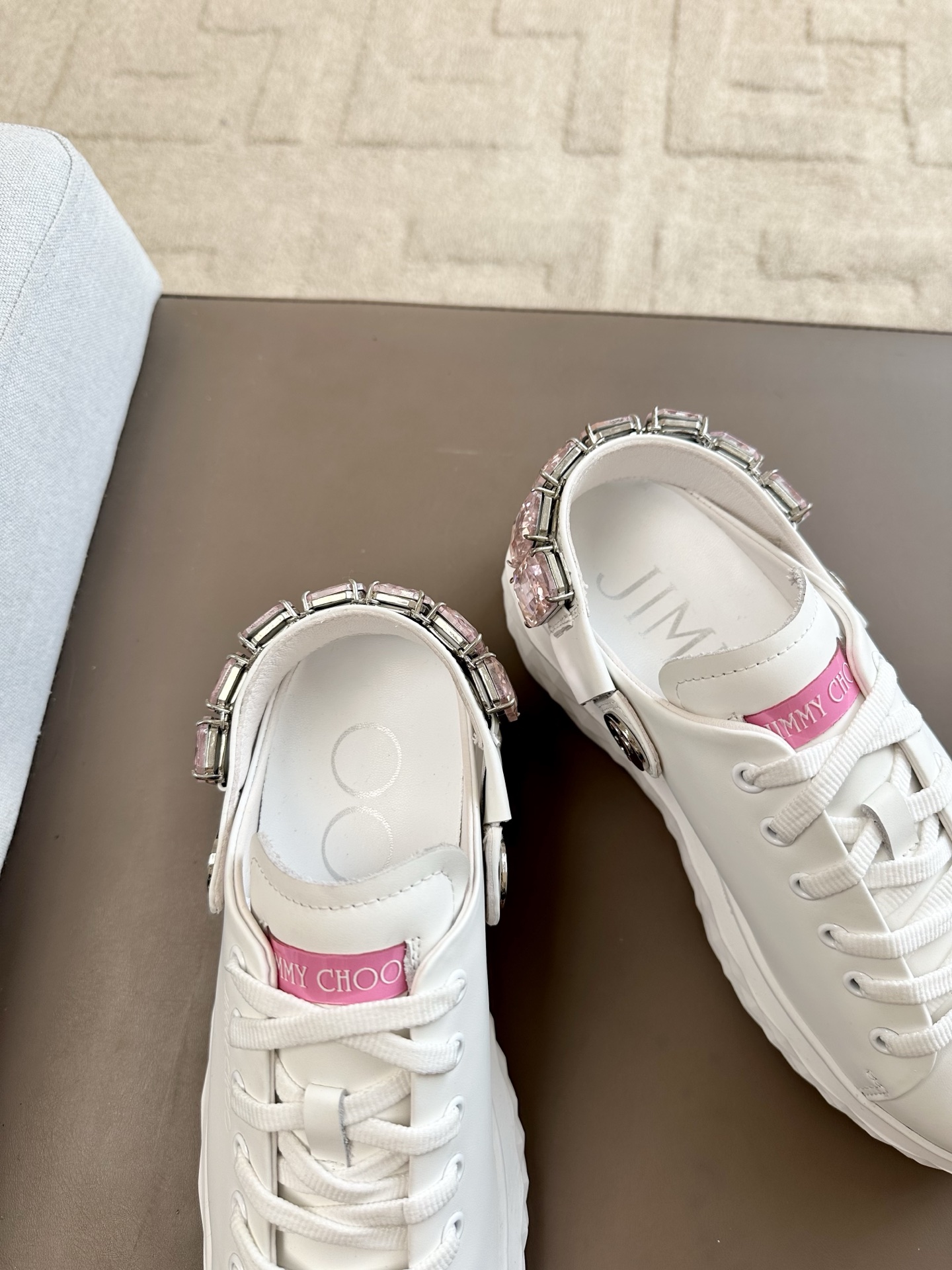 지미추 크리스털 스트랩 디테일 화이트핑크 나파 가죽 슬리퍼 스니커즈