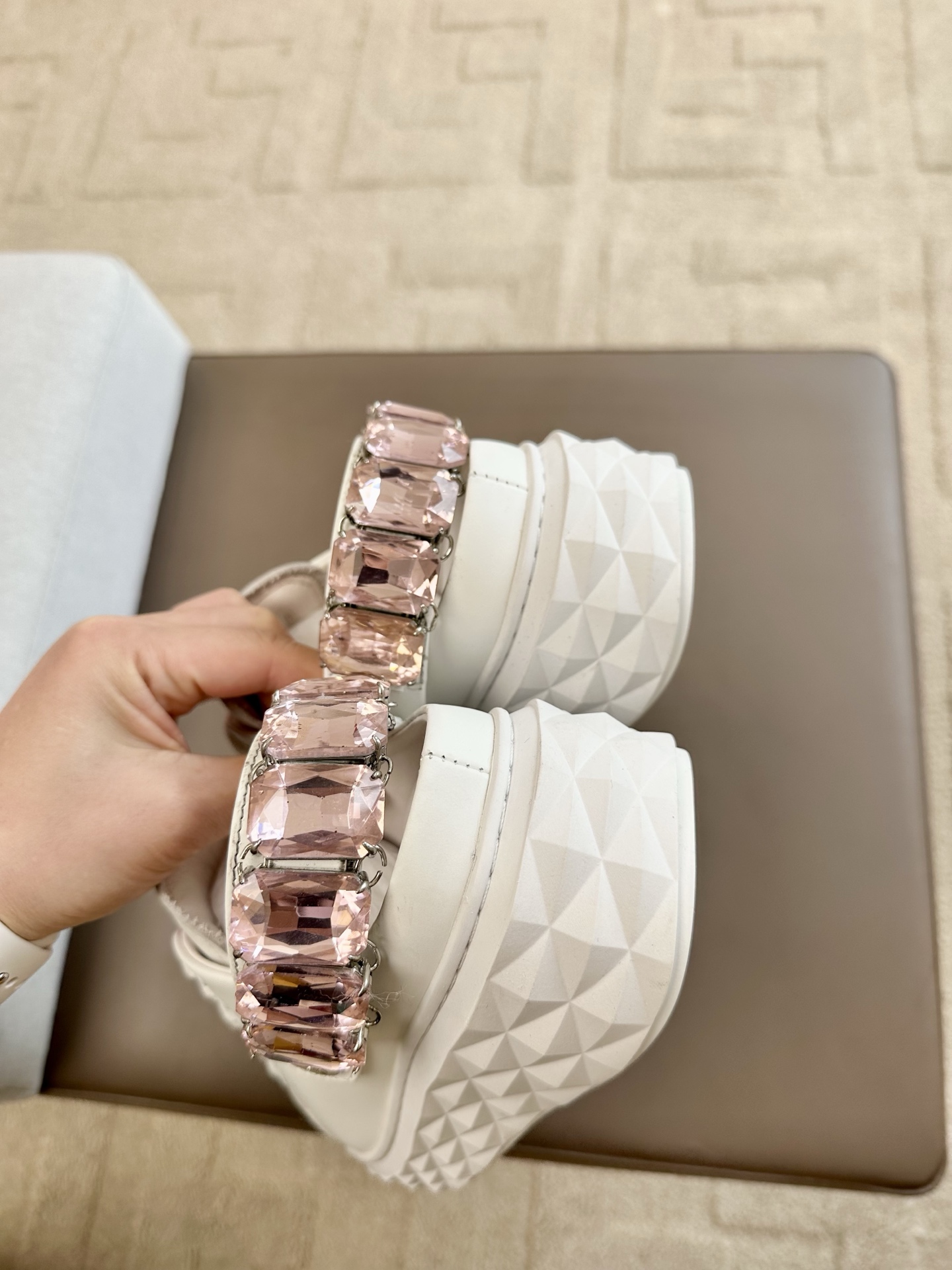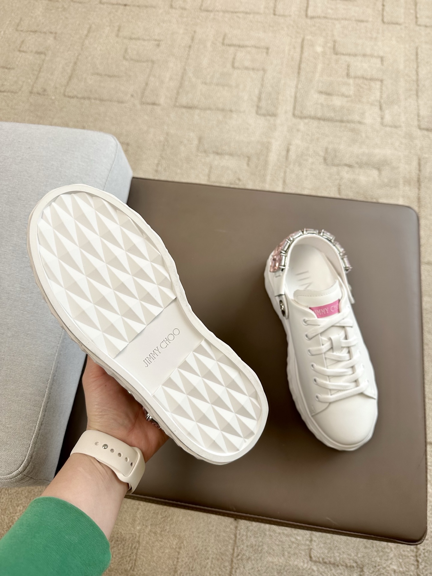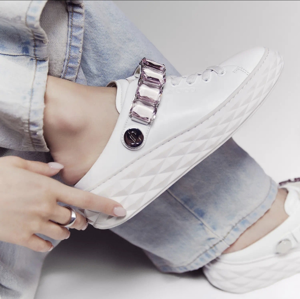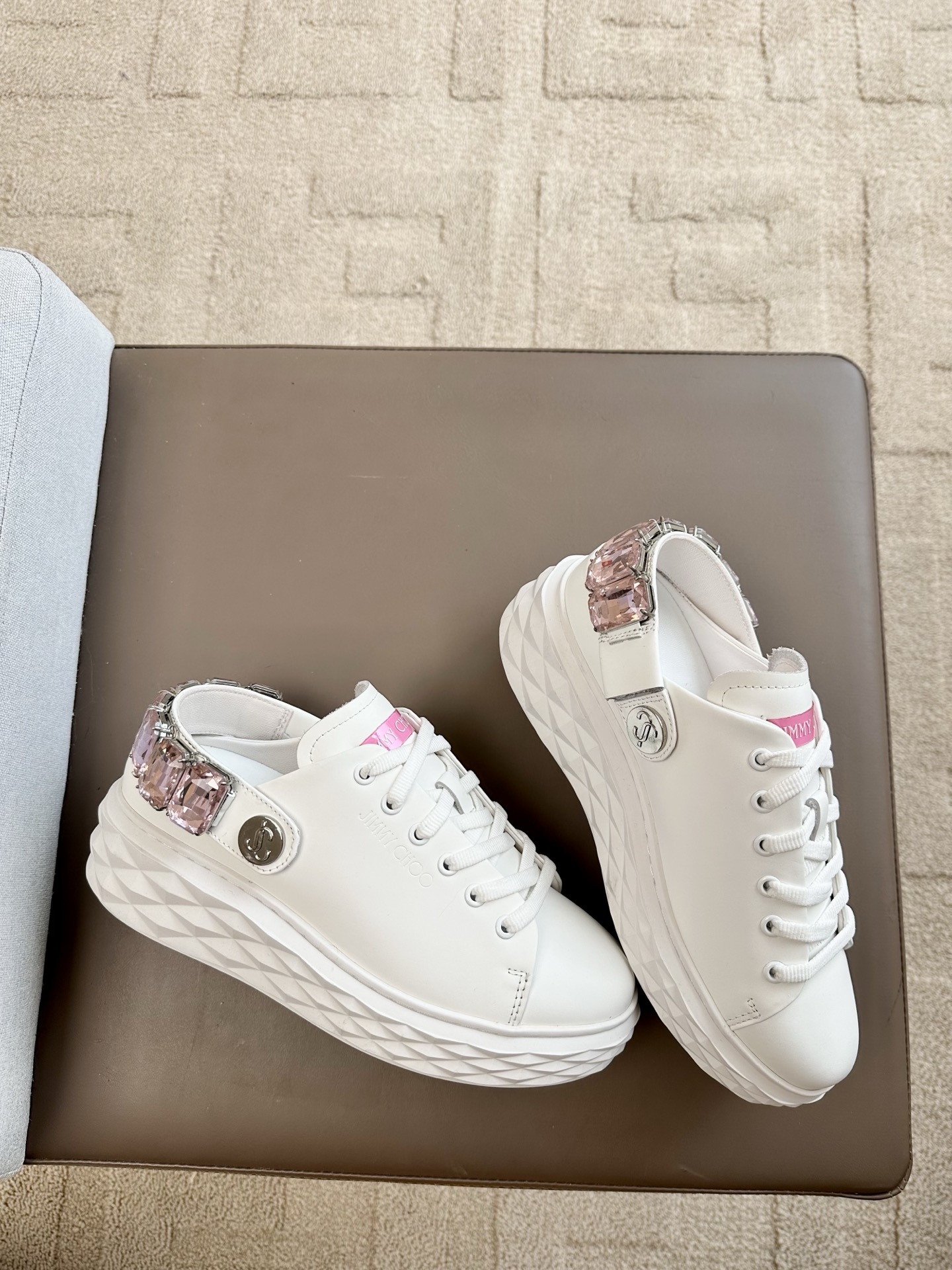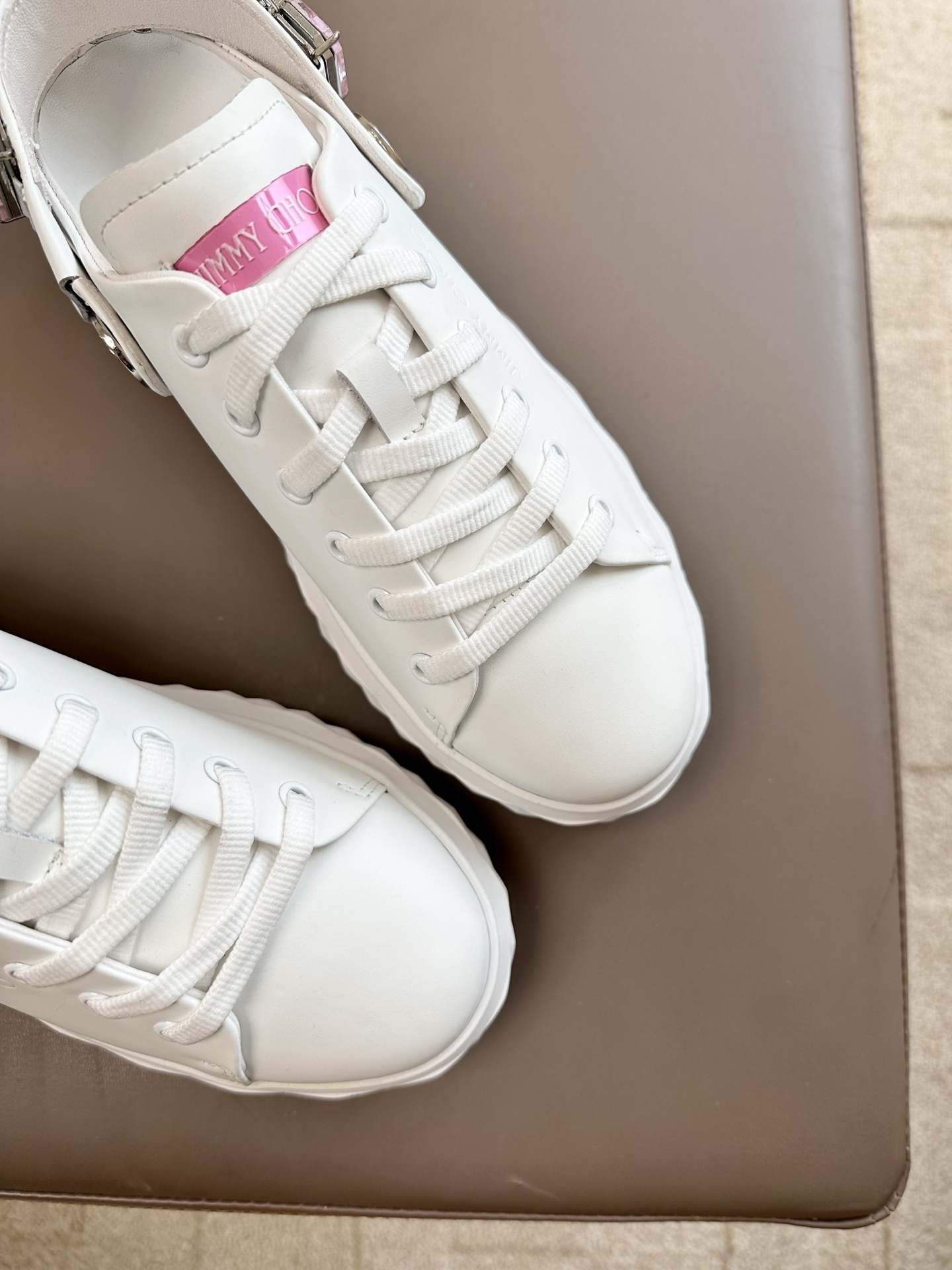 지미추 크리스털 스트랩 디테일 화이트핑크 나파 가죽 슬리퍼 스니커즈