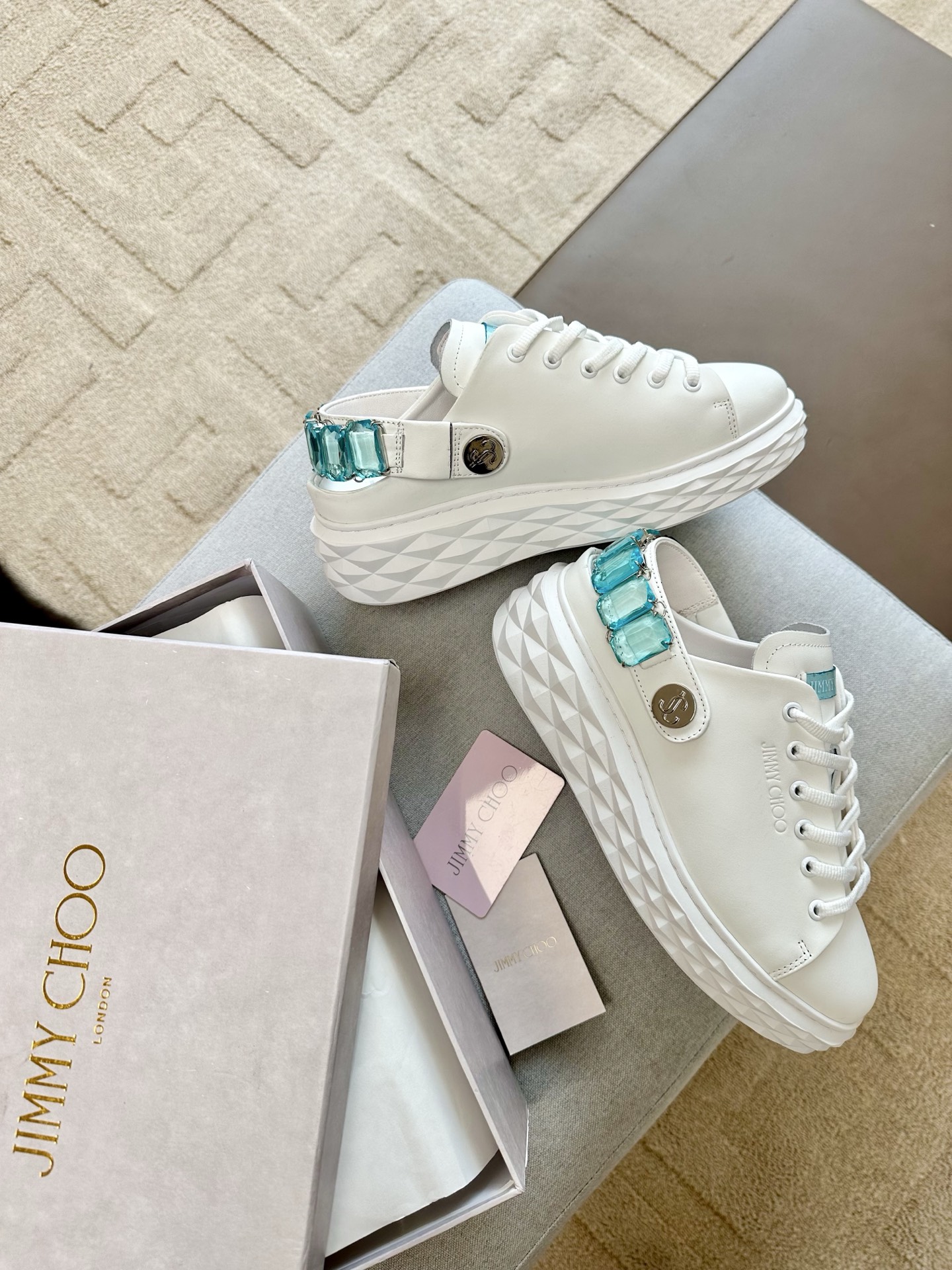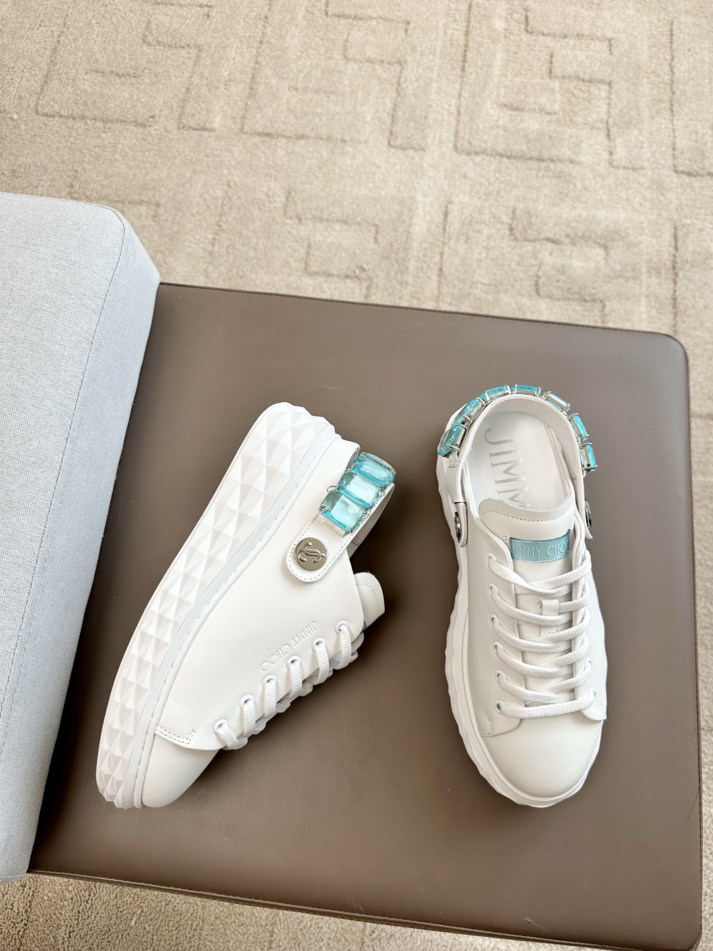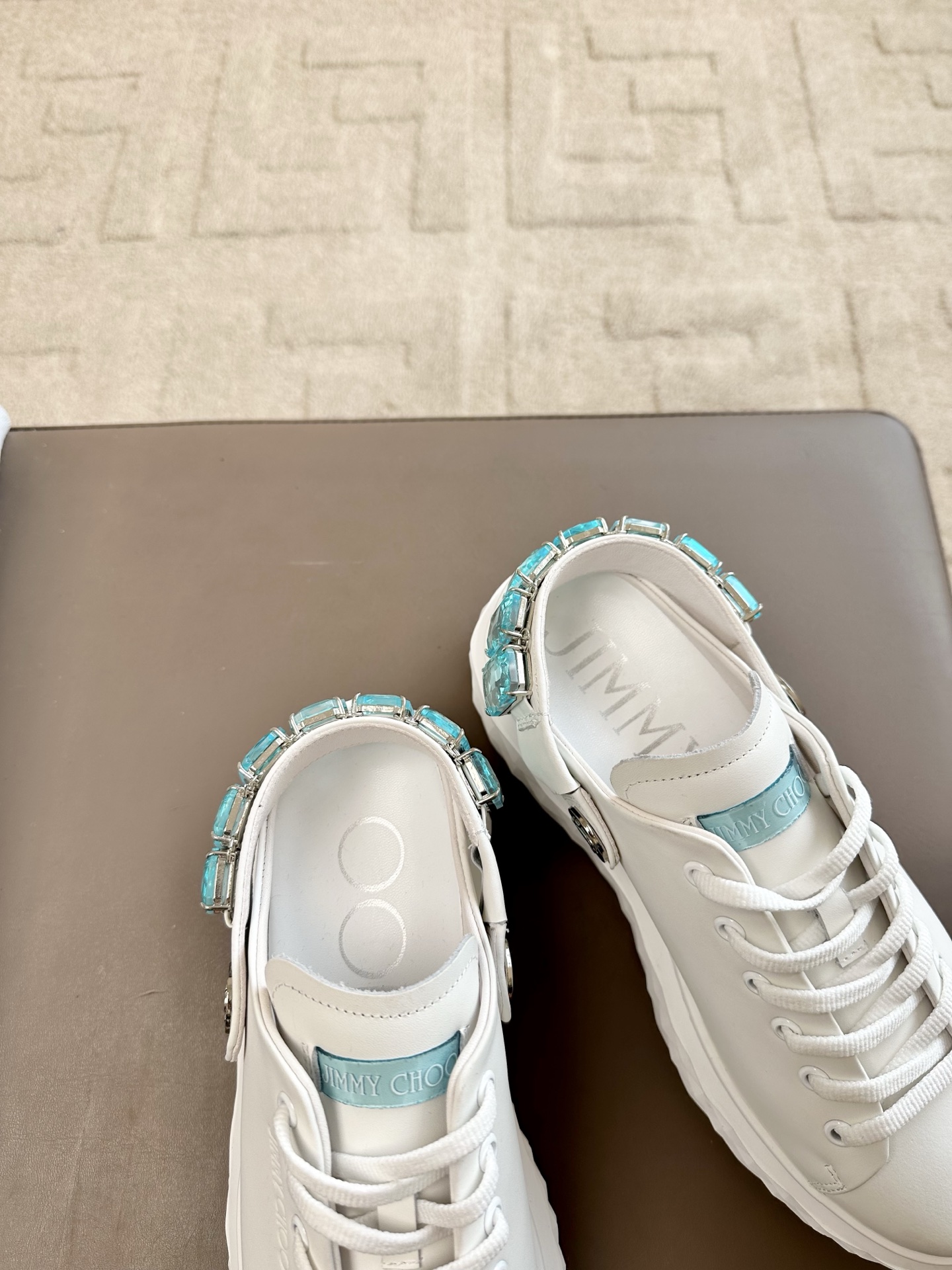 지미추 크리스털 스트랩 디테일 화이트블루 나파 가죽 슬리퍼 스니커즈