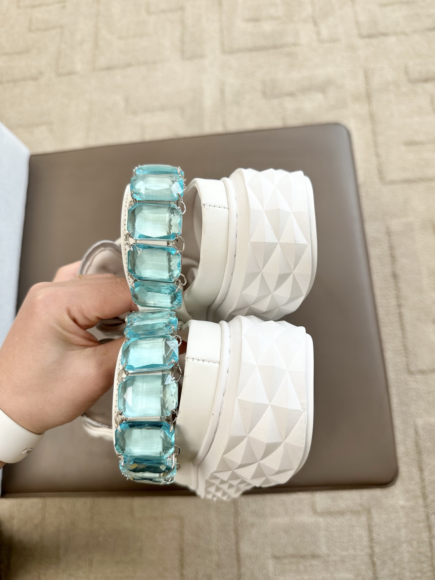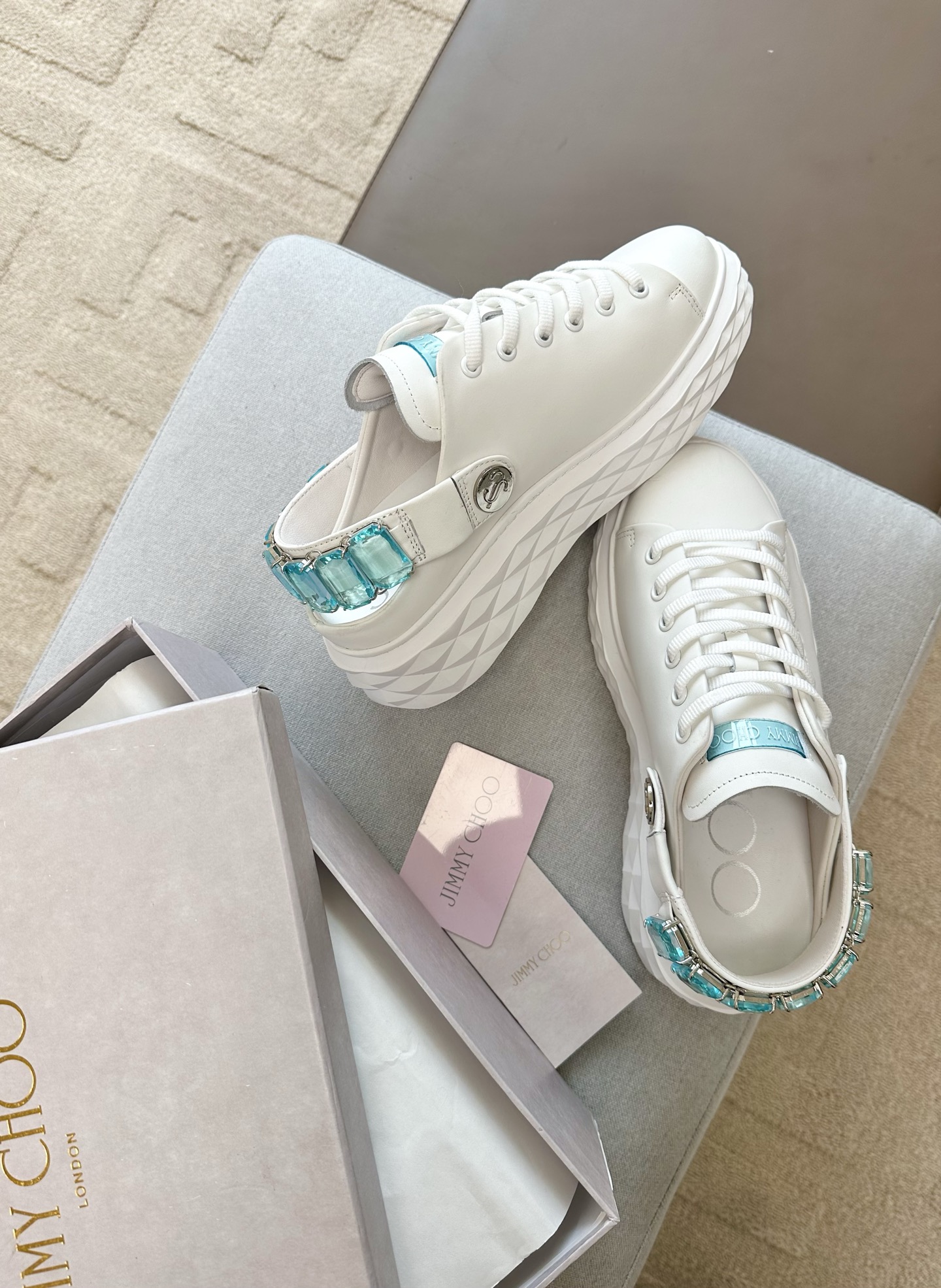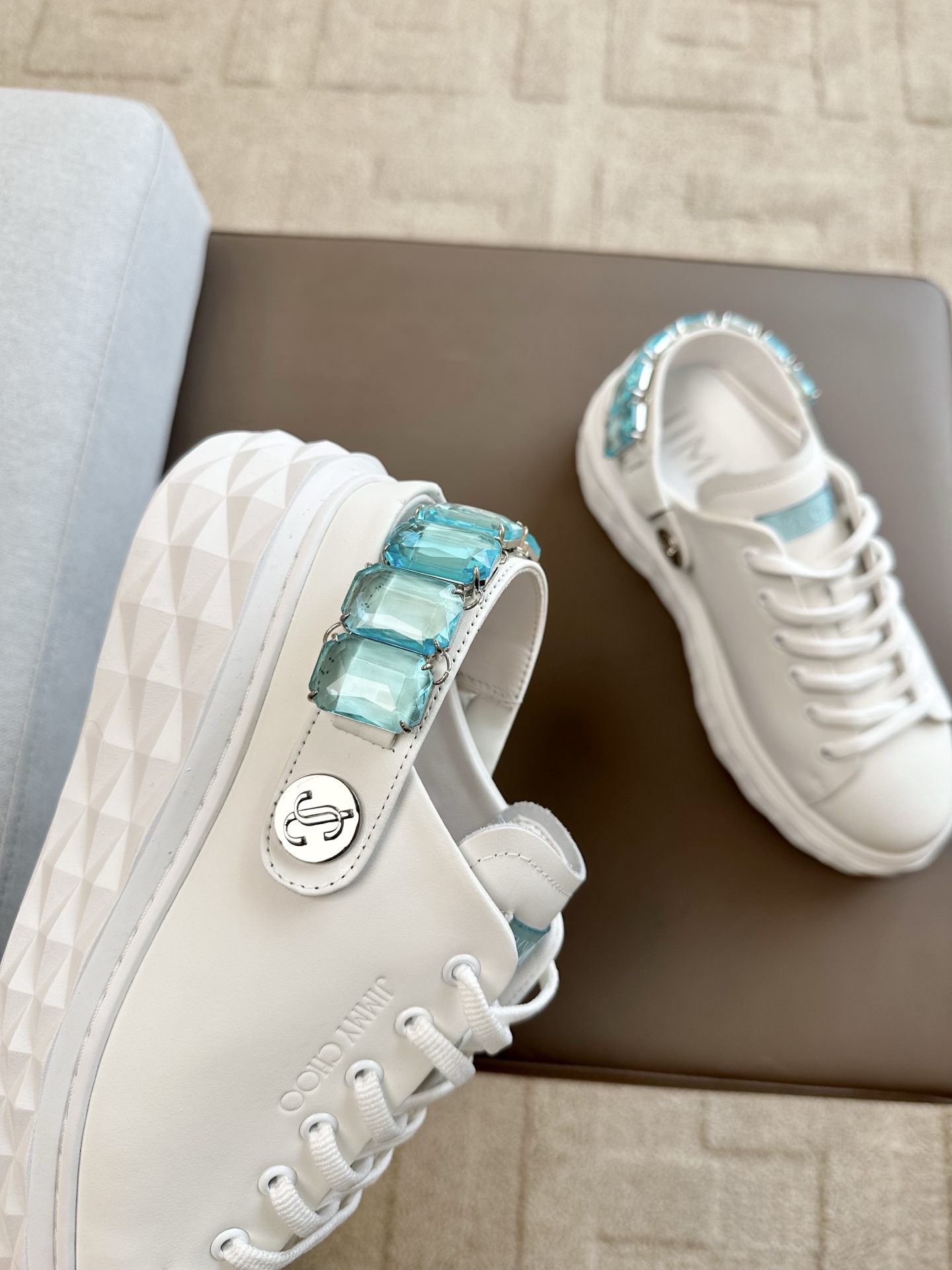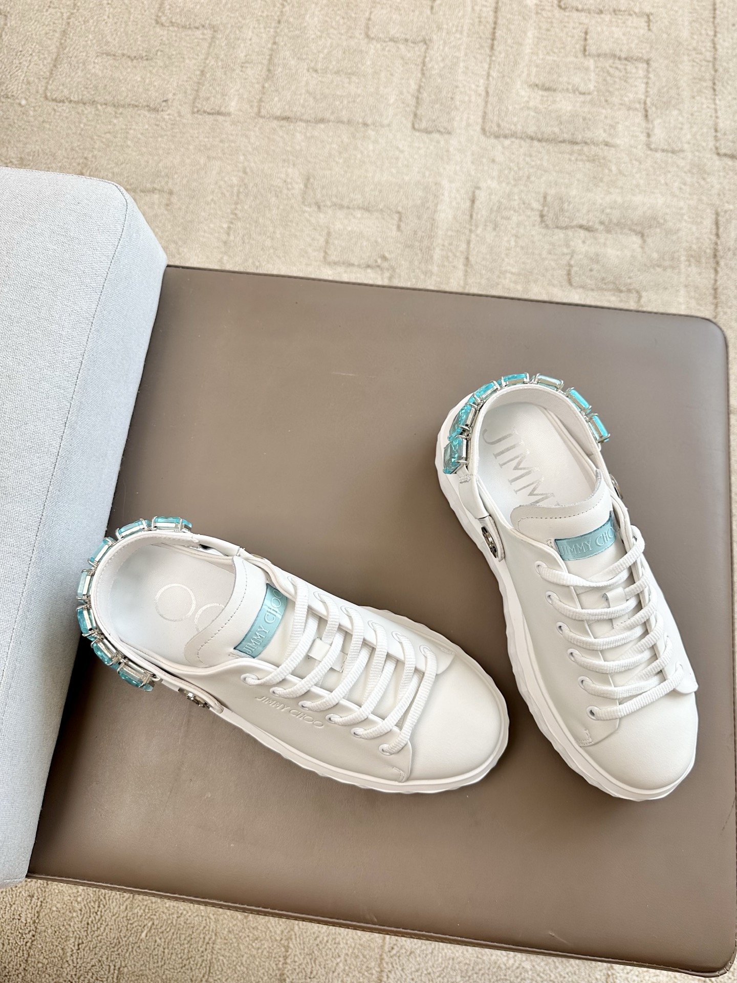 지미추 크리스털 스트랩 디테일 화이트블루 나파 가죽 슬리퍼 스니커즈