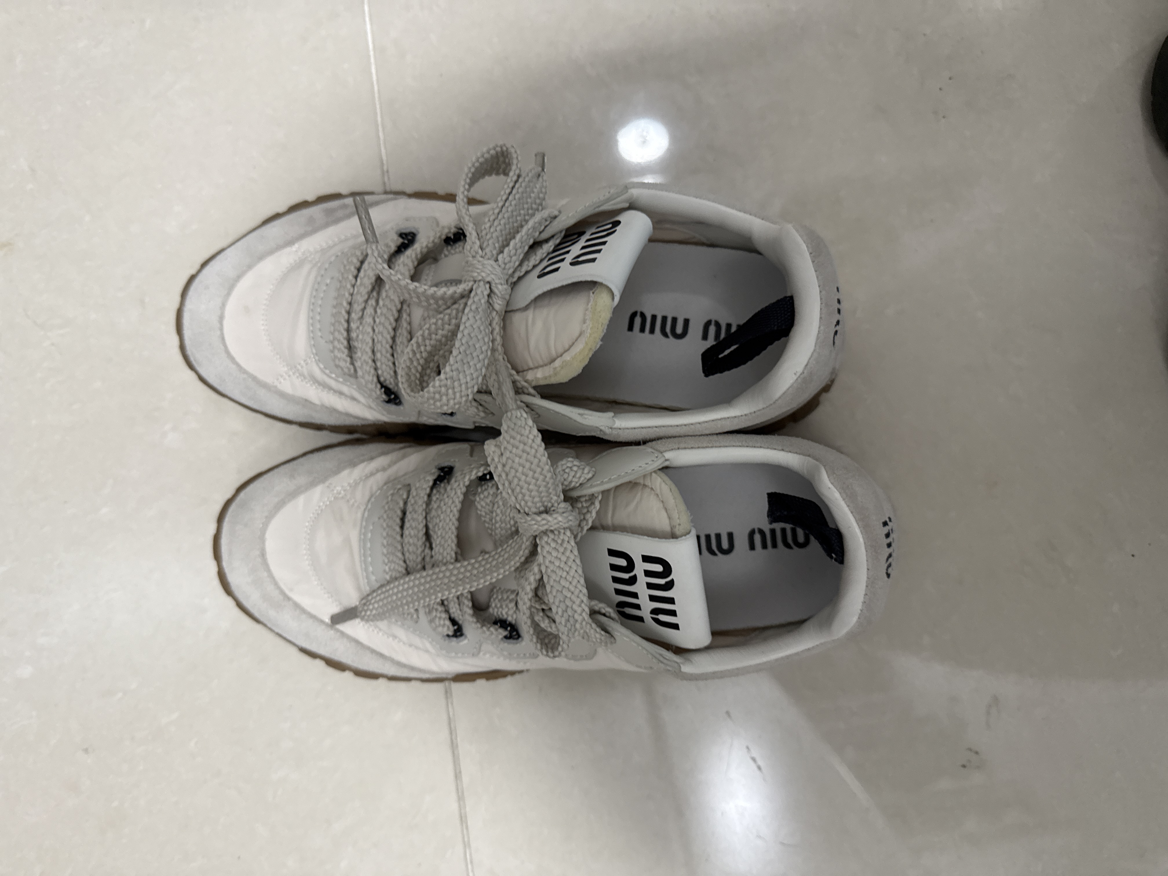 미우 미우 타이어 테크니컬 패브릭 앤 스웨이드 스니커즈 아이보리